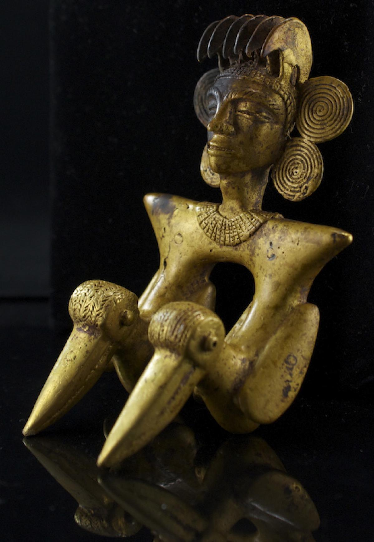 Commentary:  Half-profile view of the anthropo-zoomorphic cast gold pendant belonging to the grave goods of the main individual I07 of tomb T2. We see a seated character whose body, with the exception of neck and head, has been replaced by two twin birds. 12.1x7.5x6.8 cm. International style.
