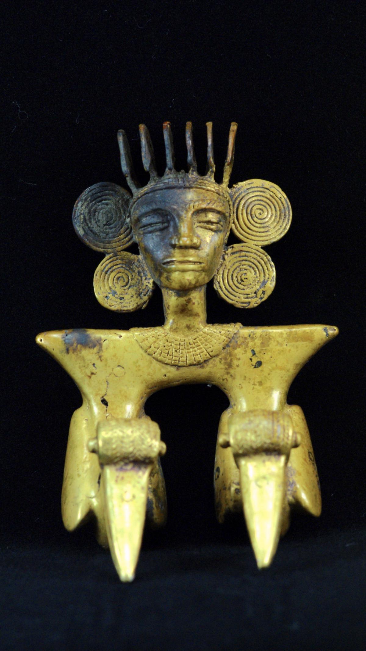 Commentary:  Front view of the cast gold figurative pendant belonging to the grave goods of the main individual I07 of Tomb T2. We see a seated character whose body, with the exception of neck and head, has been replaced by two twin birds. 12.1x7.5x6.8 cm. International style.