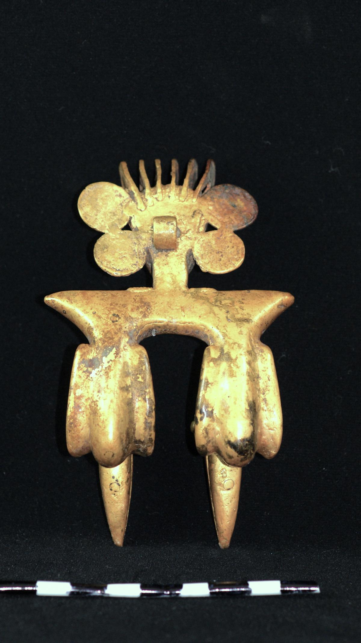 Commentary:  Rear view of the cast gold figurative pendant belonging to the grave goods of the main individual I07 of tomb T2. We can see at the nape of the neck the suspension ring of the object, which shows no traces of wear from use. 12.1x7.5x6.8 cm. International style.
