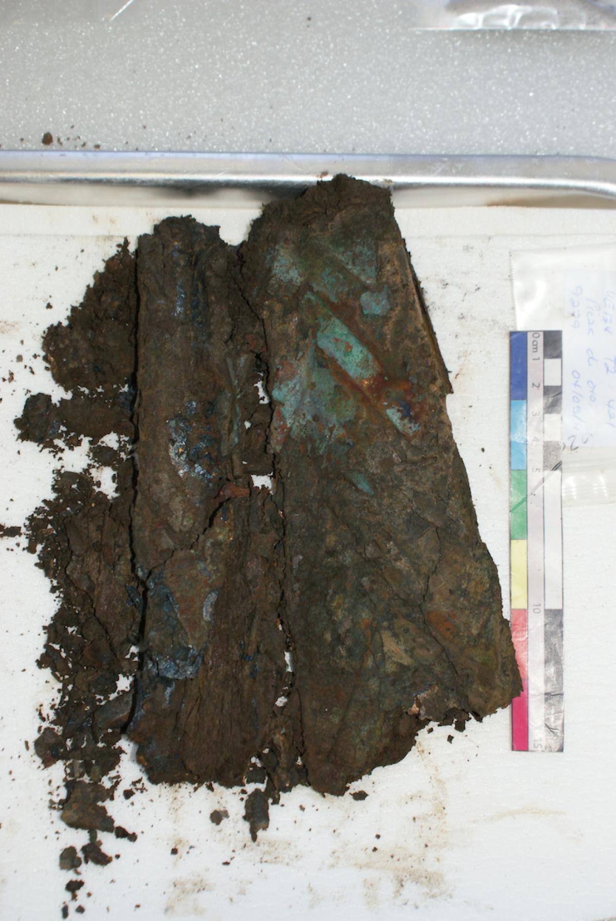 Commentary:  A very deteriorated tumbaga bracelet (9279.3) and a section of the ulna and radius were found within it.