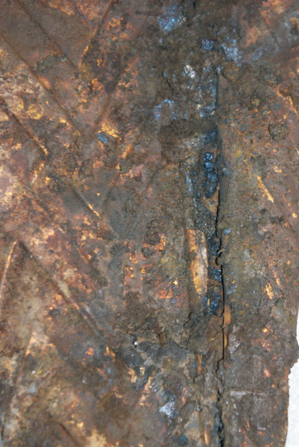 Commentary:  Adhered to the exterior was found an unctuous material, probably resin, and a dark, iridescent substance.