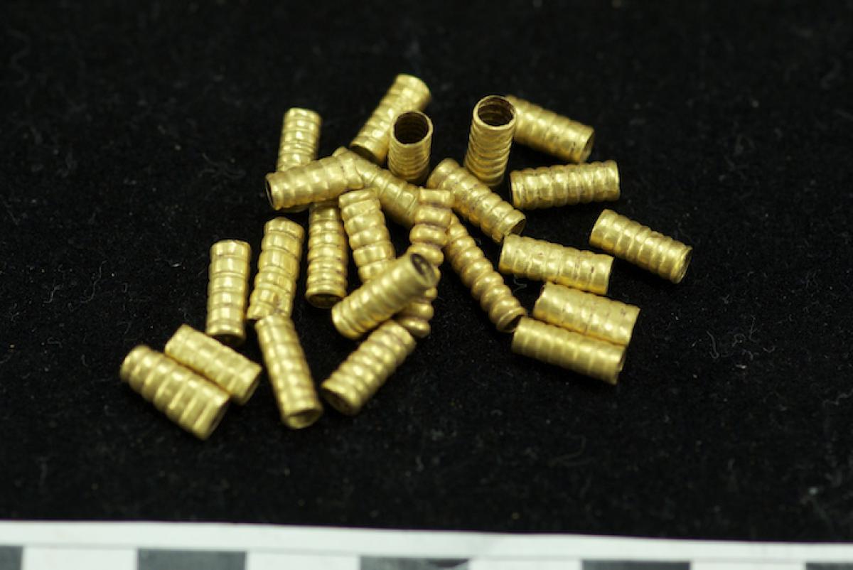 Commentary:  Twenty-four tubular gold beads. A number between nine and six embossed bands are distributed over the surface of each one of them.