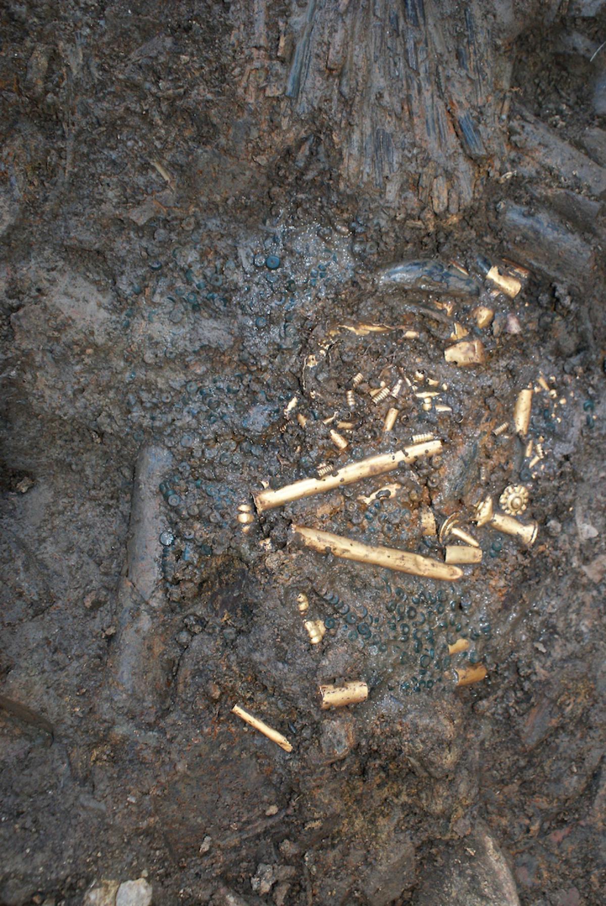 Commentary:  Package of artifacts found on the remains of the individual I7 in the unit UE134 of tomb T2. In this image you can see ear rods with a gold tubular body and the casings of other wooden ear rods. The stone bases of two mirrors, a set of circular accessories for garments, a set of cruciform accessories for garments and the gold sheathing of a seahorse pendant were also found on these artifacts - not shown in the photo.