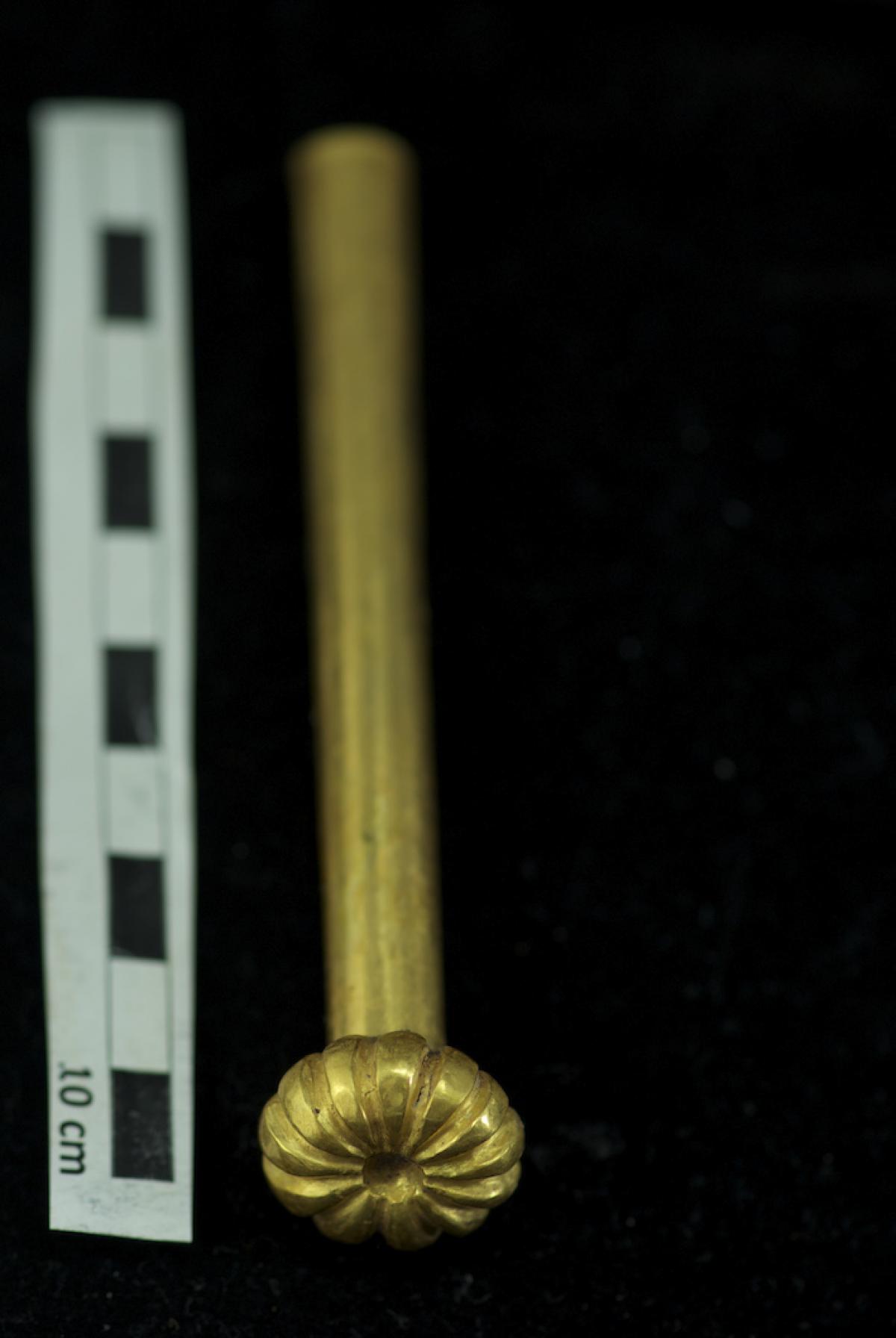 Commentary:  Package of artifacts found on the remains of the individual I7 in the unit UE134 of the tomb T2. In this image you can see ear rods with a gold tubular body and the casings of other wooden ear rods. The stone bases of two mirrors, a set of circular accessories for garments, a set of cruciform accessories for garments and the gold sheathing of a seahorse pendant were also found on these artifacts - not shown in the photo.
