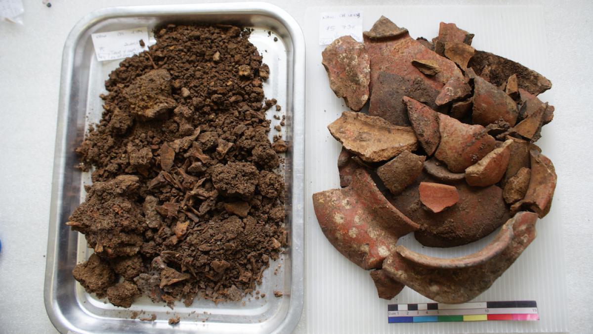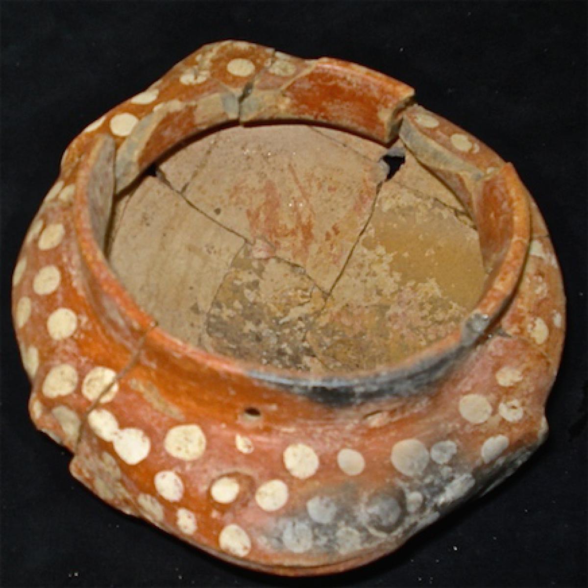 Commentary:  Vessel before being restored next to the remains of the spines found inside. Two of the spines are from specimens of Guentheridia formosa and one spine from a specimen of Sphoeroides annulatus.