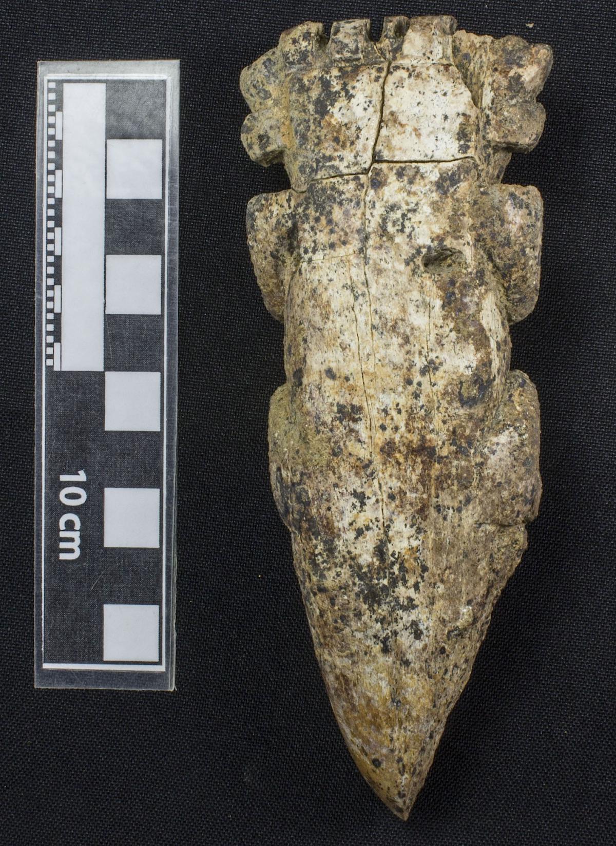 Commentary:  Manatee rib carved into the shape of a mythical being. Rear view of the artifact.