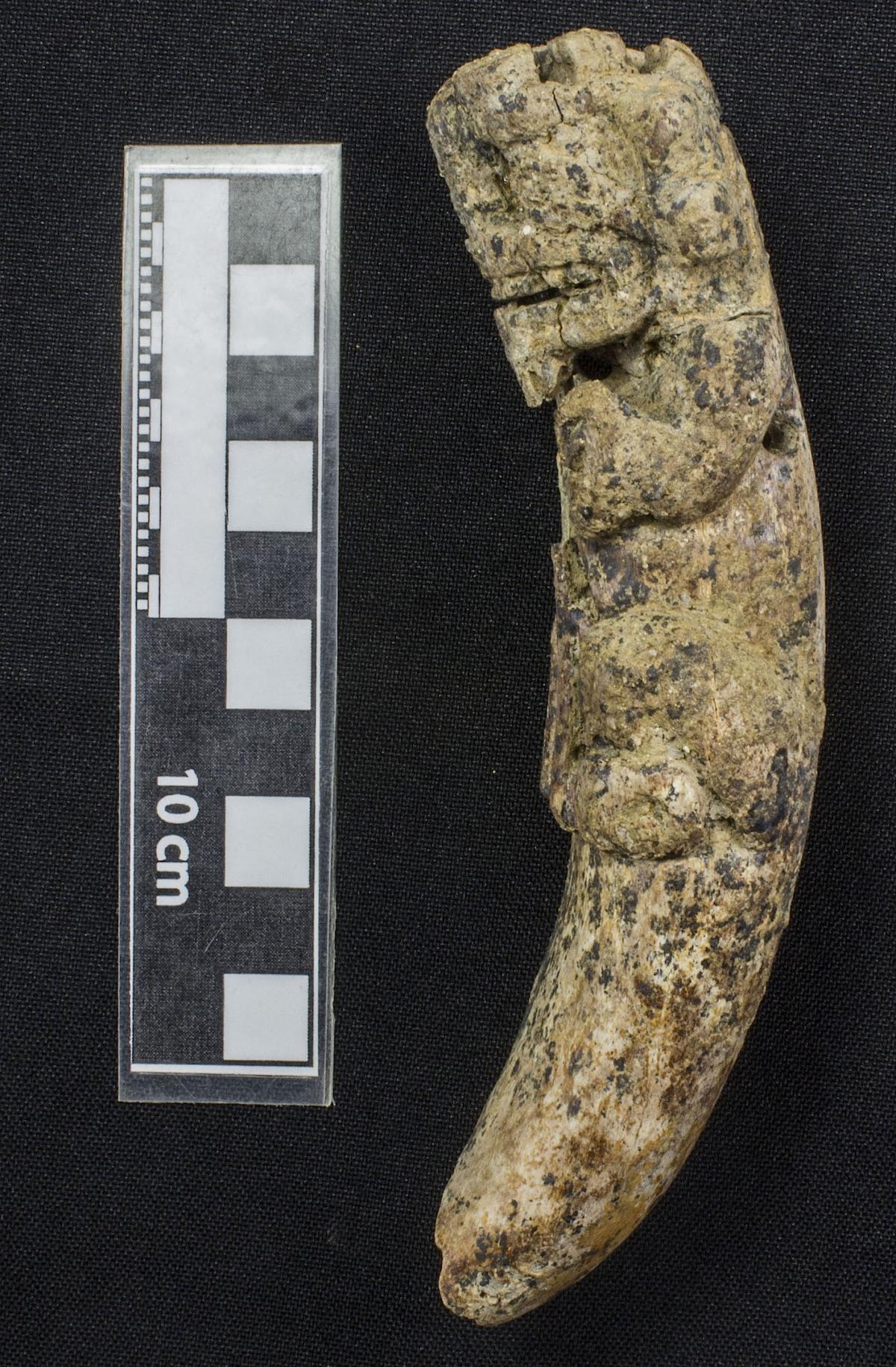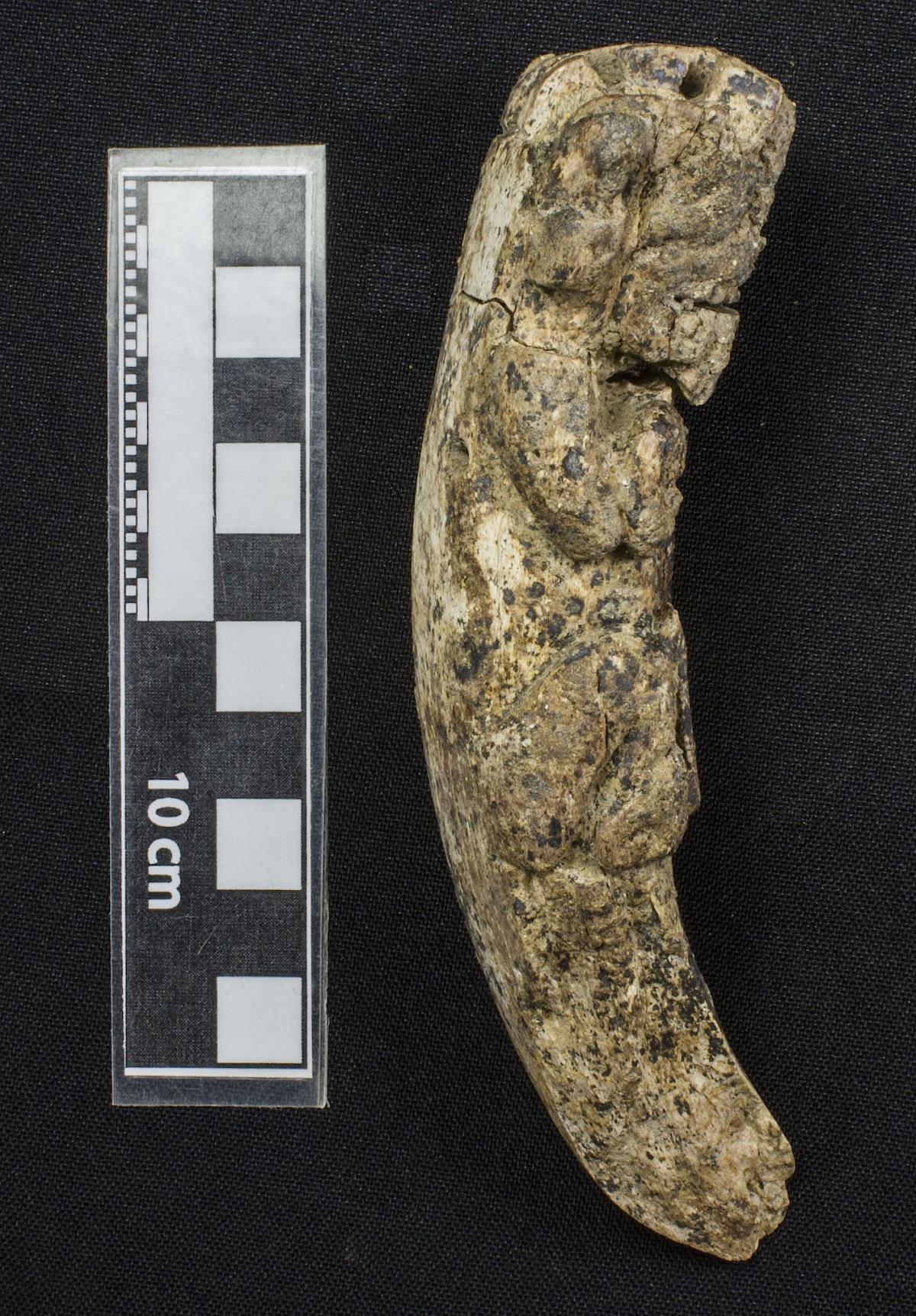 Commentary:  Manatee rib carved into the shape of a mythical being. Right side view of the artifact.
