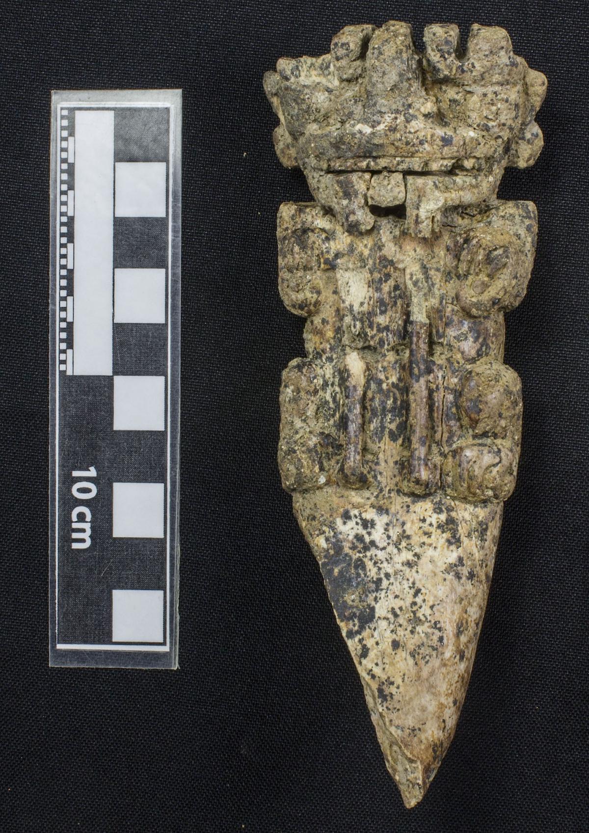 Commentary:  CManatee rib carved into the shape of a mythical being. Front view of the artifact.