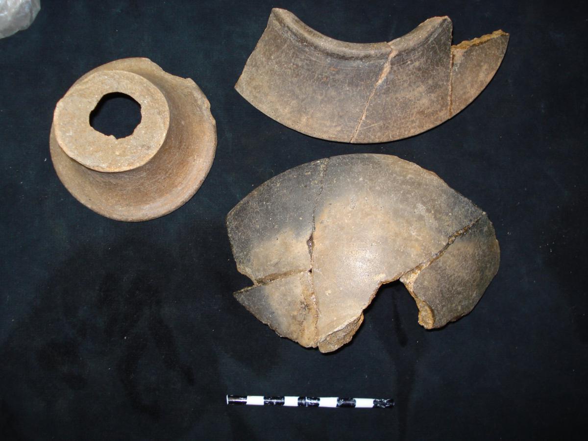 Description :   Carinated bowl on a pedestal. Dark brown surface resulting from being fired in a confined space. This ceramic was collected in different bags, so it has several registers.
