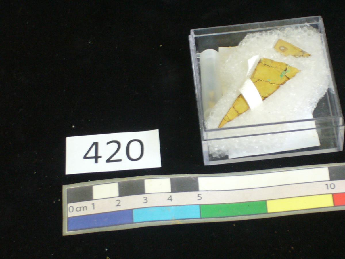 Description :   Gold clothing ornament. Triangular-shaped pieces of hammered sheet gold with small attachment holes to allow it to be sewn to clothes.