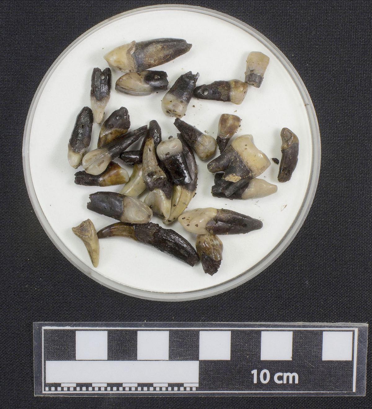 Description :   Perforated human teeth, canines, premolars and molars; and perforated dog teeth and premolars.