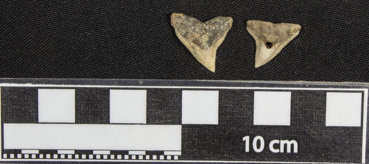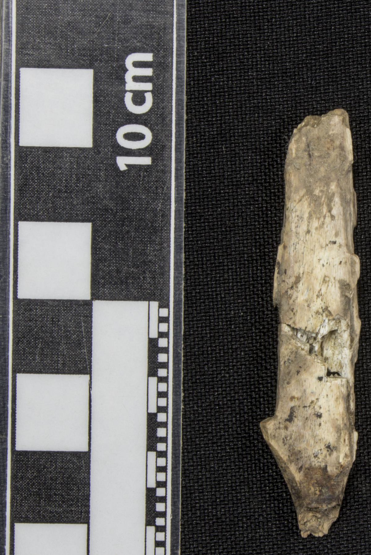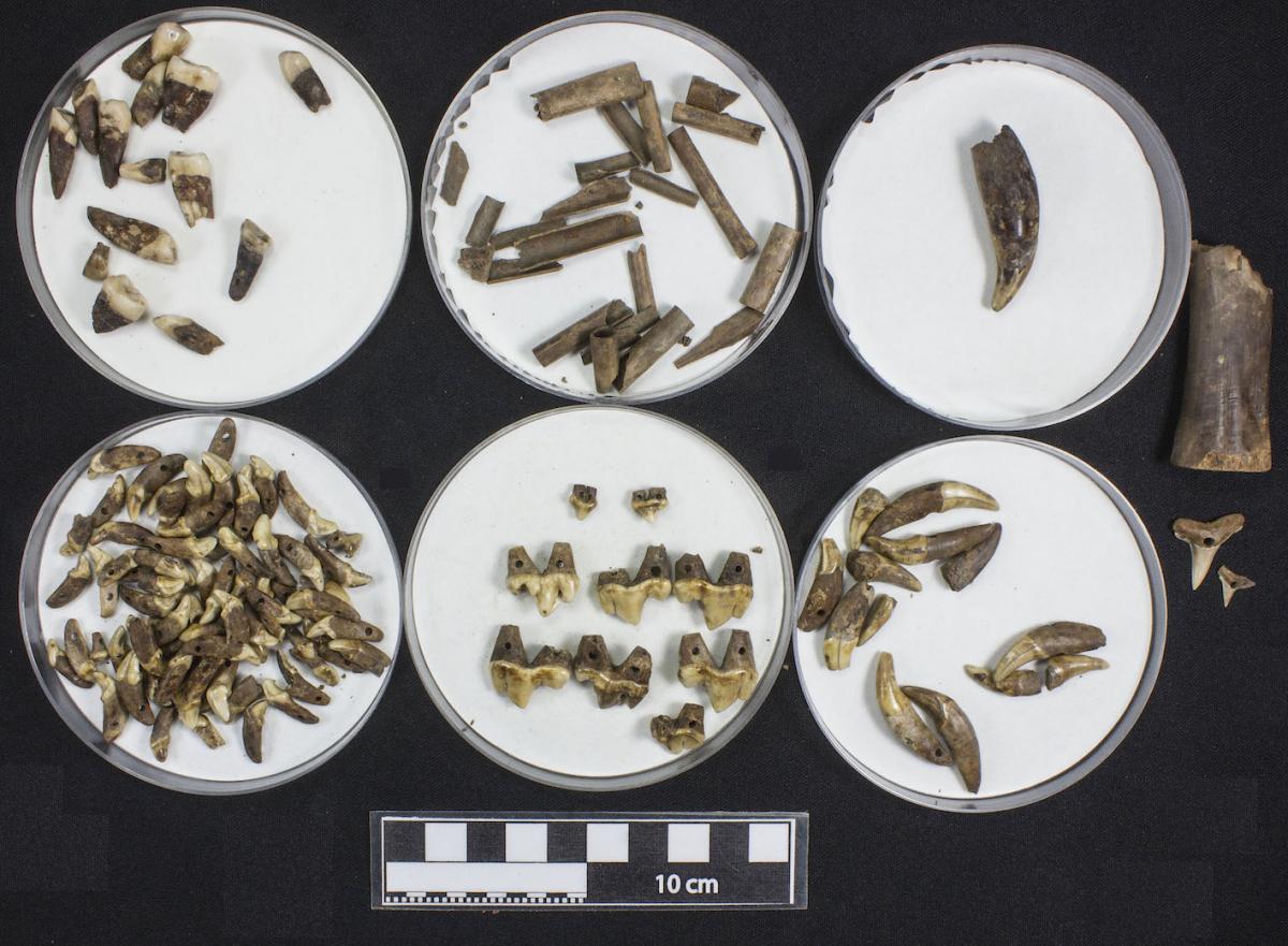 Description :   This collection of bones and teeth contains: perforated human teeth, premolars, molars and canines; perforated dog teeth, canines and premolars; perforated shark teeth; tubular bird bone beads; a feline canine; and a bone fragment.
