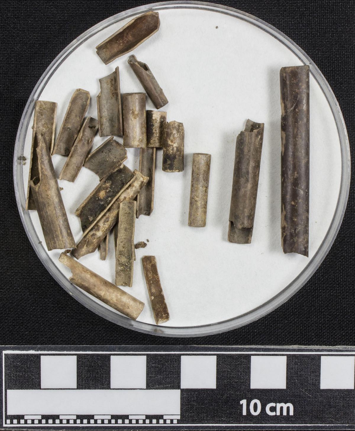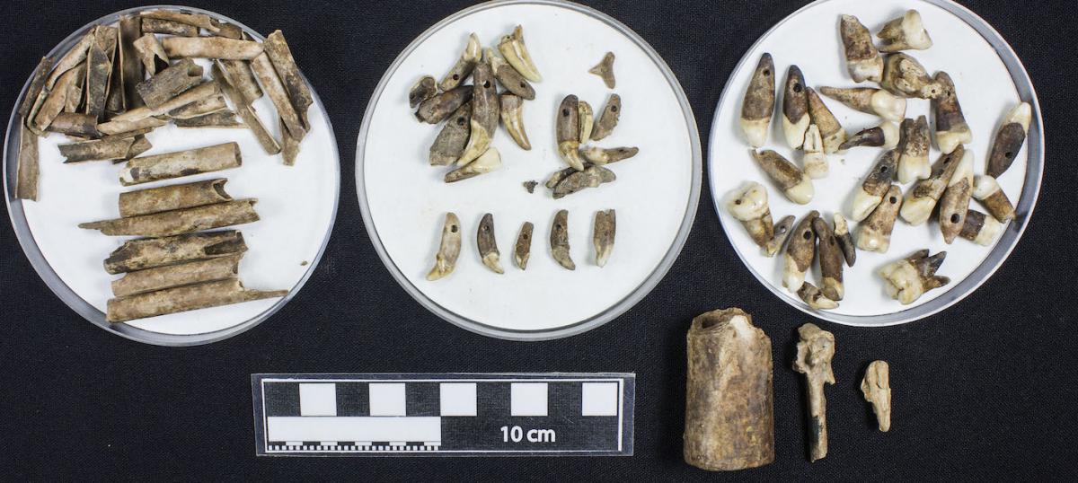 Description :   Perforated human teeth, premolars and molars; perforated dog canines and teeth; and tubular bird bone beads.