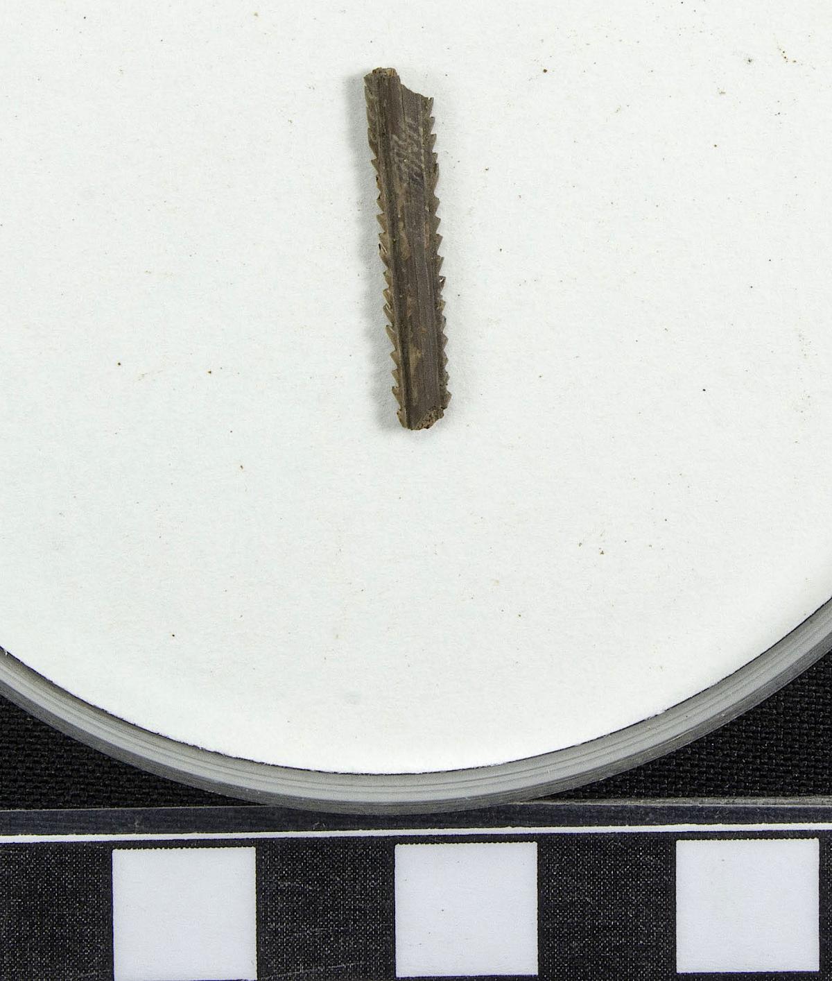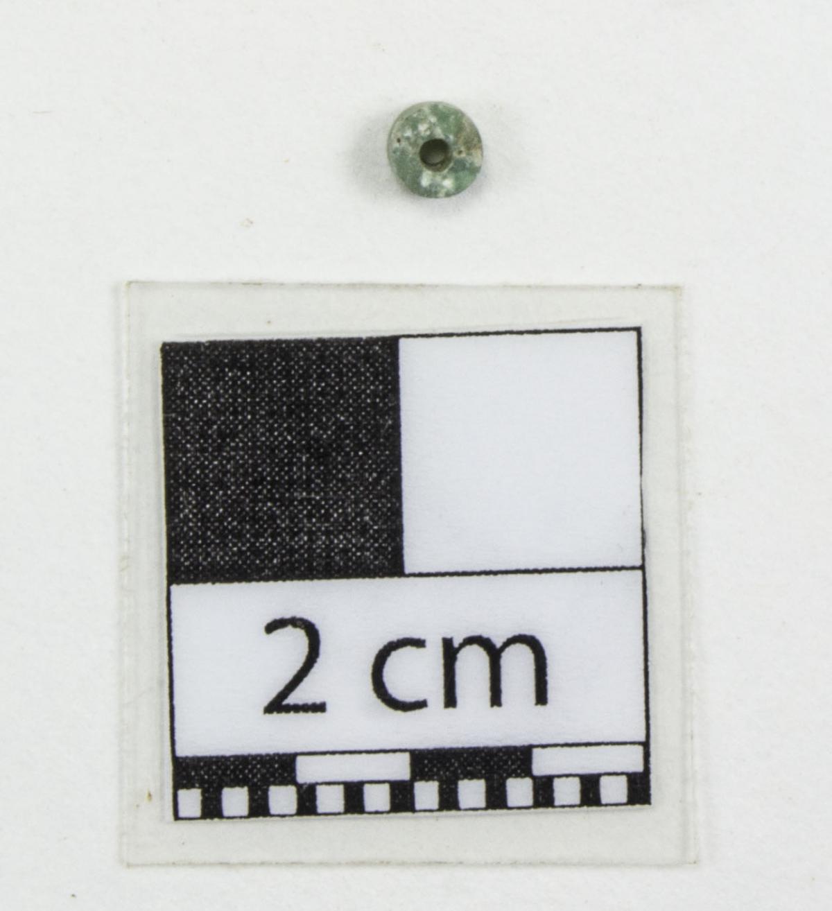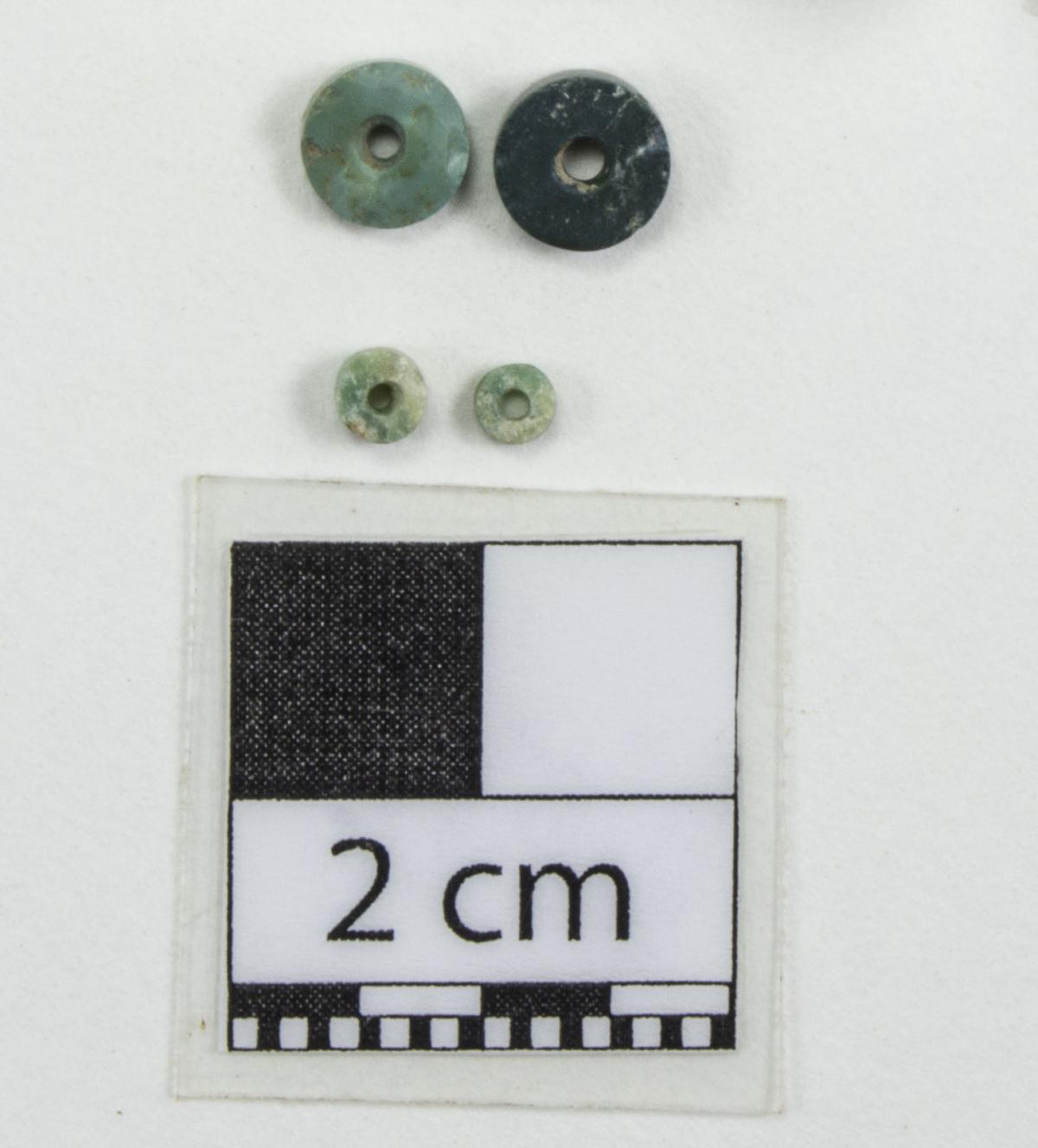 Description :   Discoidal bead with a straight edge, made from the core of a light green stone.