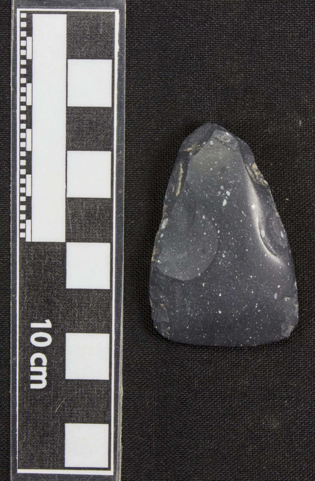 Description :   Almond-shaped stone axe. It has a very polished distal surface. The rest of the artifact is ground yet marks from the cutting of the stone (the procedure of shaping before the grinding), can still be seen.