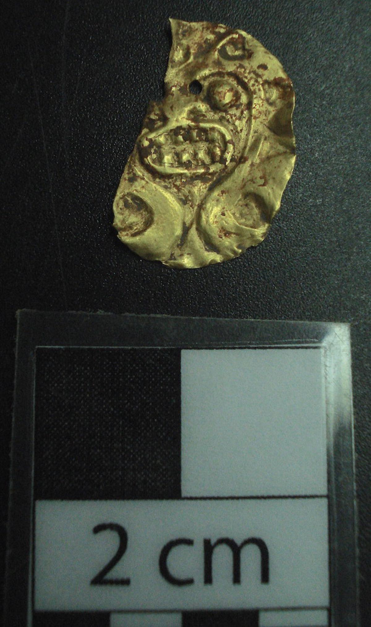 Description :   Circular accessory with the design of a face of a mythical being on the interior. It is broken but an eye, nose, and an open mouth with many teeth, can still be seen. The face is surrounded by a kind of garland with scrolls at the ends.