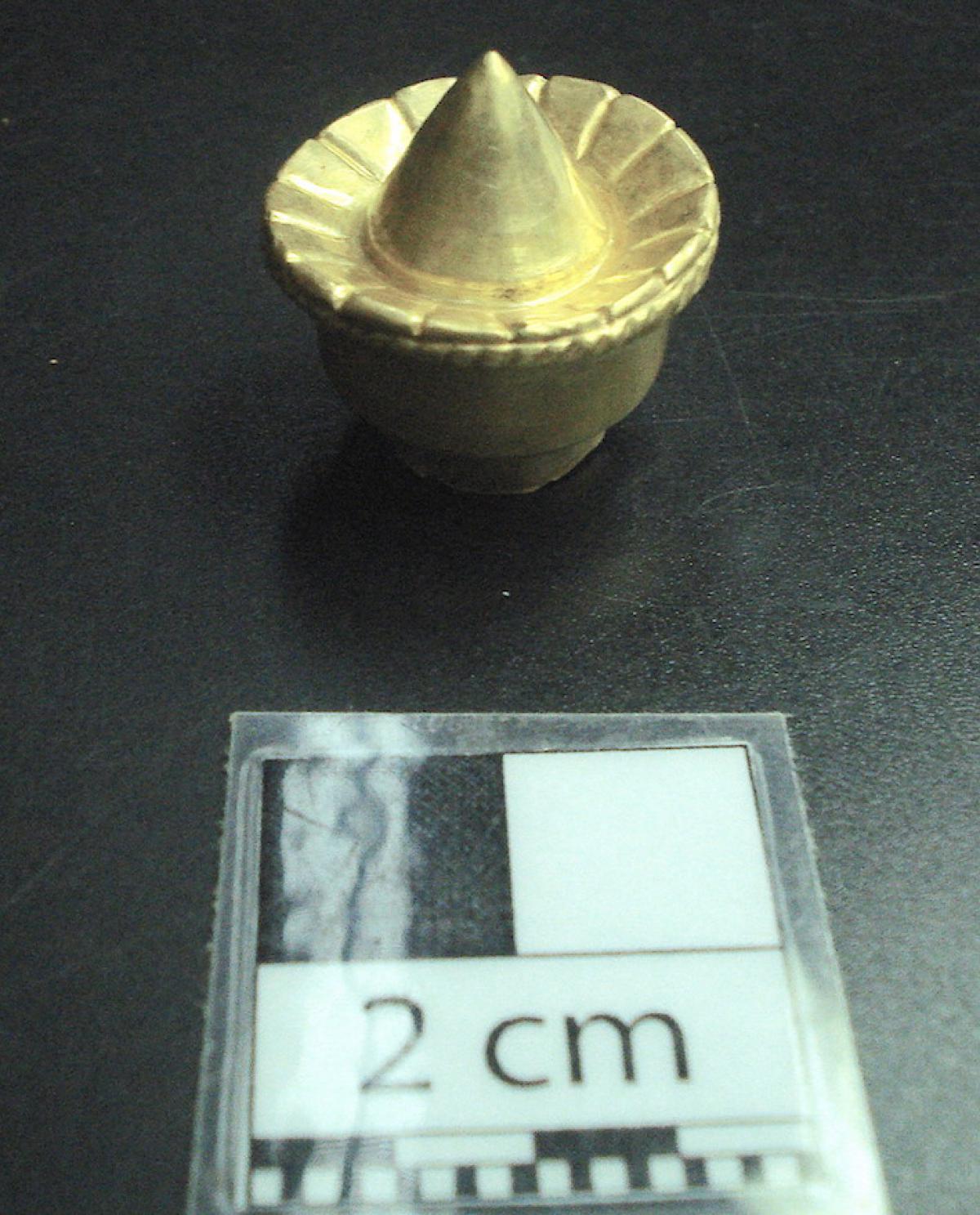 Description :   Ear rod cap. It has, as decorative elements, a cone in the centre that projects outwards with short embossed parallel lines radiating from it, and an embossed braid around the edge.