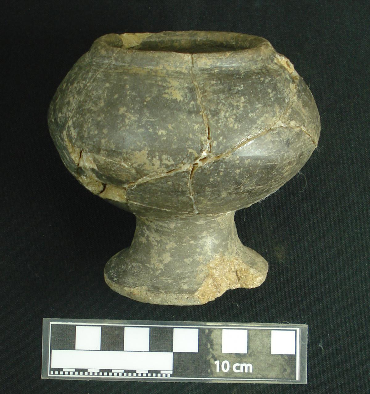 Description :   Concave bowl on a pedestal. It has a raised rim. The black color is a product of the firing of the piece in an enclosed space.