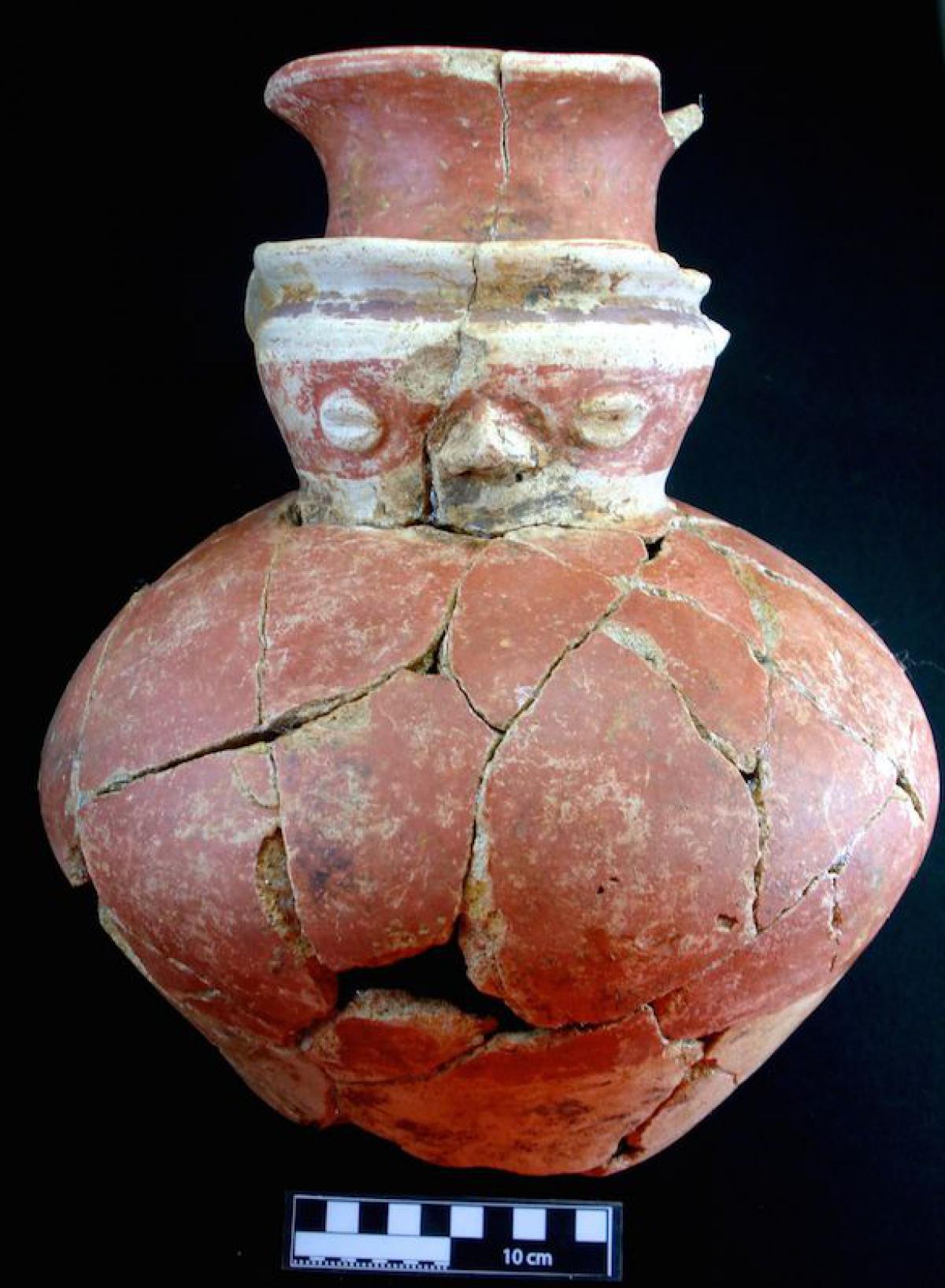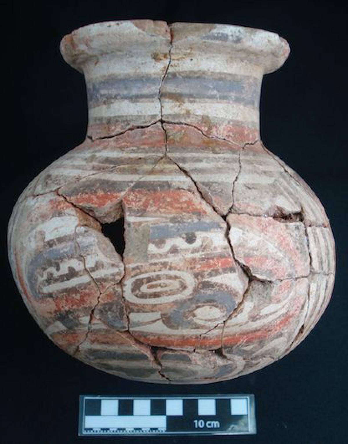 Description :   Globular vessel without a ring base. It has a long neck, and a laterally displaced rim. It is covered in white slip and painted with convergent “yc” spirals that have saurian designs on their inner ends. The neck is decorated with alternating red and blue bands.