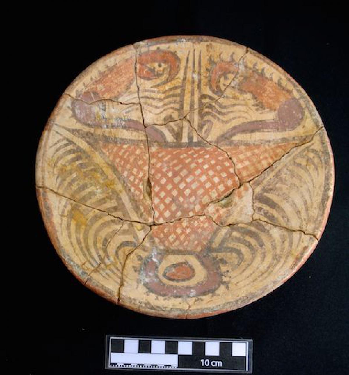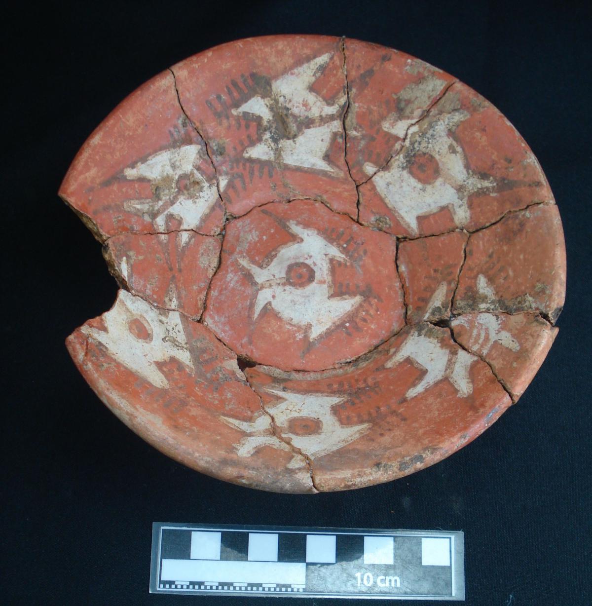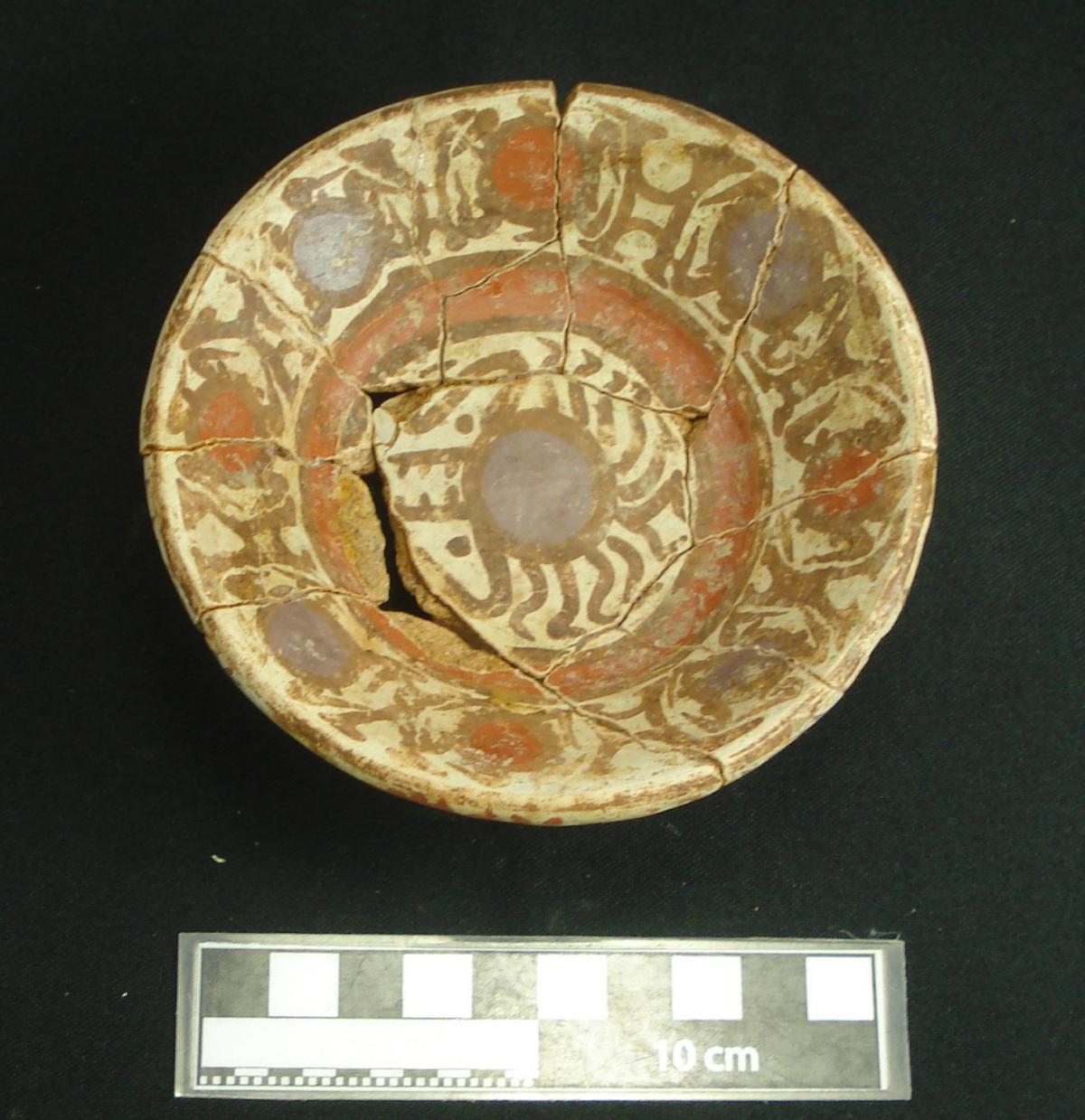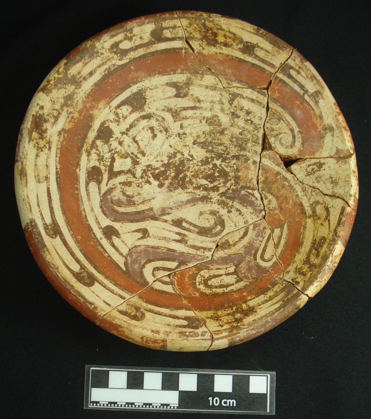 Description :   Plate with a ring base. Red slip on the exterior and white on the front on which the polychrome decoration has been applied. The lip is decorated with bands of colors evoking the color pattern of the coral snake. The central design is serpentiform. Its poor state of conservation does not allow the design to be appreciated clearly.