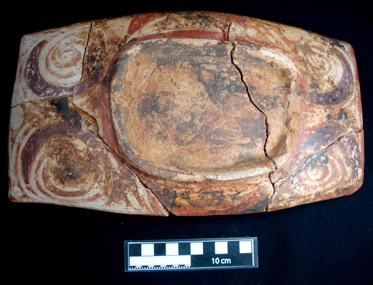 Description :   Rectangular tray with white slip on the exterior and red slip on the front of the piece. The raised rim is decorated with geometric patterns. The exterior is painted with red and purple spirals which are outlined in black. These spirals are convergent, and the inner ends terminate in claw-like foreshortenings.