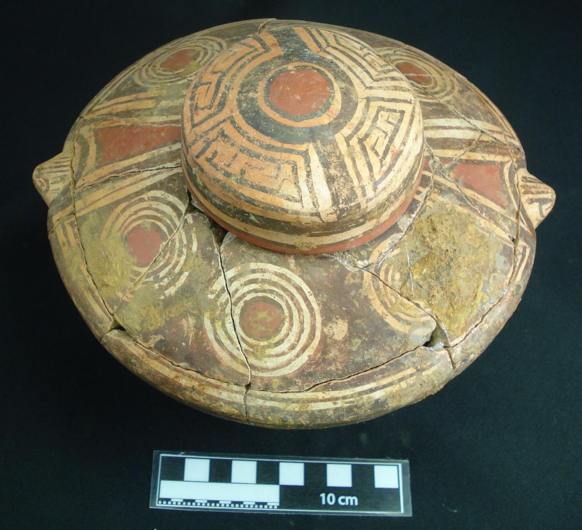 Description :   Ceramic piece made up of a bowl and a zoomorphic effigy that represents a bicephalous turtle. It is covered in white slip on which are painted circular patterns in red and black that represent the chelonian shell of the turtle.