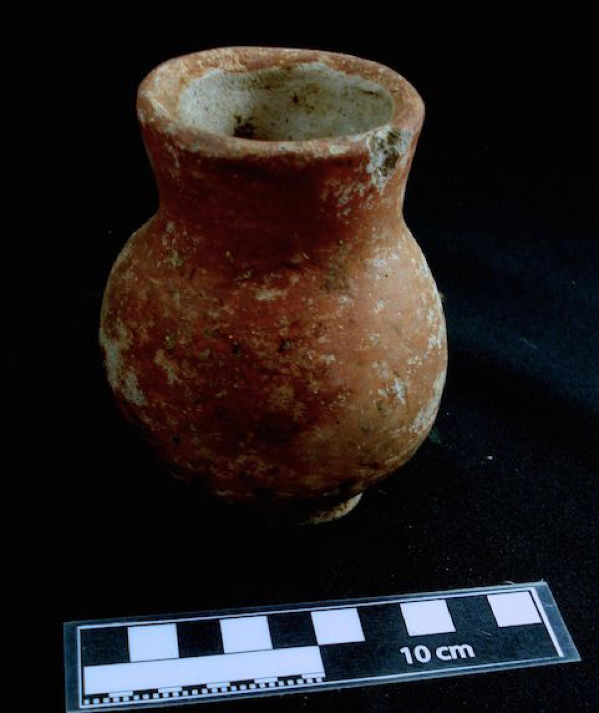 Description :   Globular vessel with a ring base, long neck, and a rim that is pointed on the exterior. Red slip.
