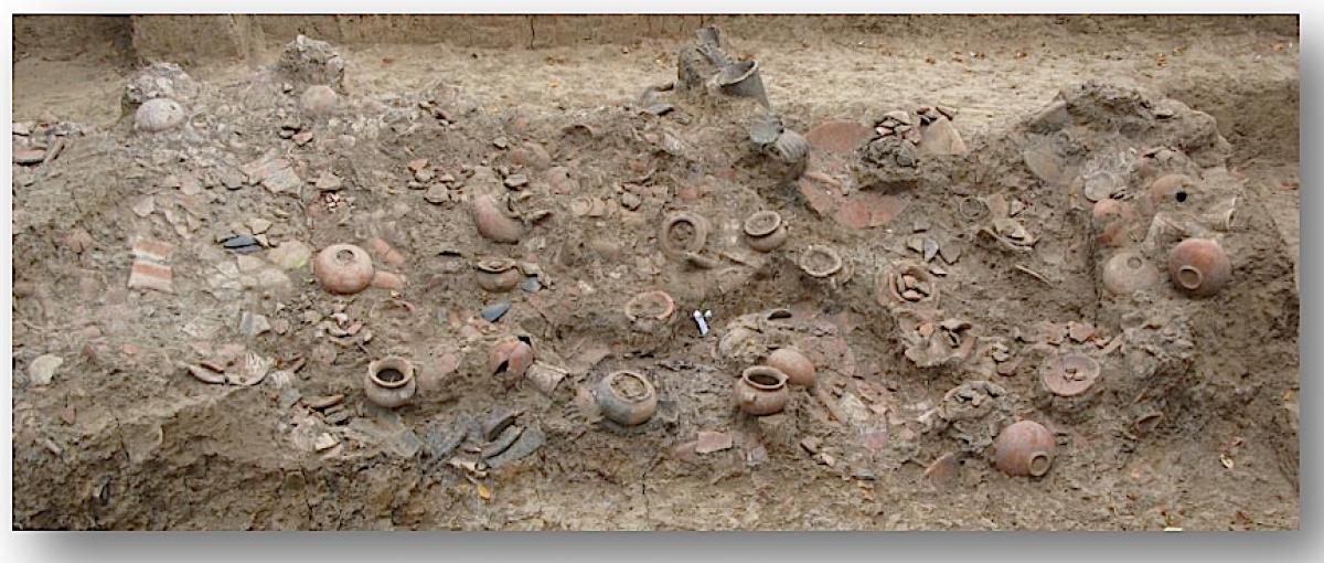 Description :   EU138. Ceramic deposit and remains of a wooden decking, located at a depth of 3.48 m (upper level) and 3.31 m (lower level). The remains of the parquet have parallel black veins which give it the appearance of being charred. It also contains coals. The ceramic is fragmented, but retains its original geometry. The edges of the UE138 unit rests on a step excavated halfway up in the lower vessel of the tomb pit T2. The subsequent portion of the feature is attached to the fillings that filled this part of the pit (UE137) and is placed on it along its entire perimeter, at an approximate angle of 40...