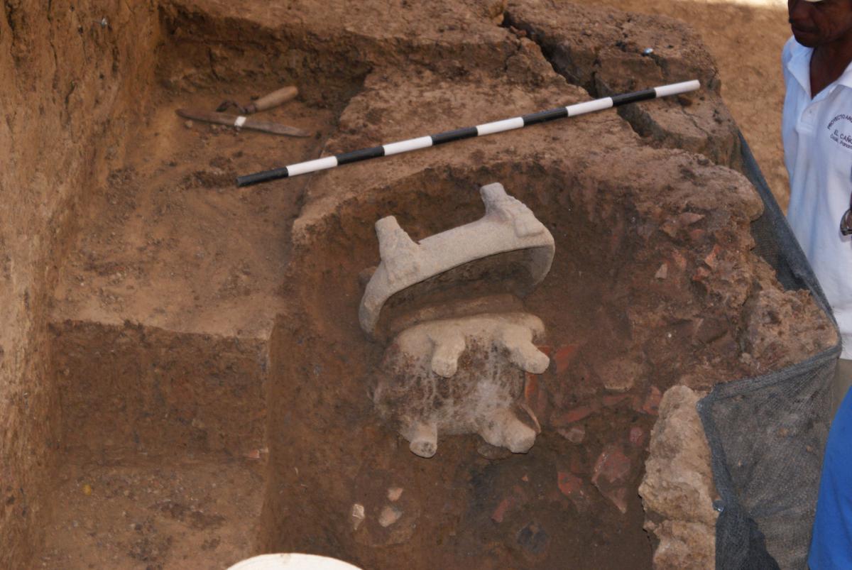 Description :   UE109. Set of ceramics, mostly high red pedestals. There are also two metates and two hand grinders. Some shark teeth and a whole late pitcher were also found. One of the metates is an effigy representing a quadruped. The other metate has its four supports sculpted with anthropomorphic figures.