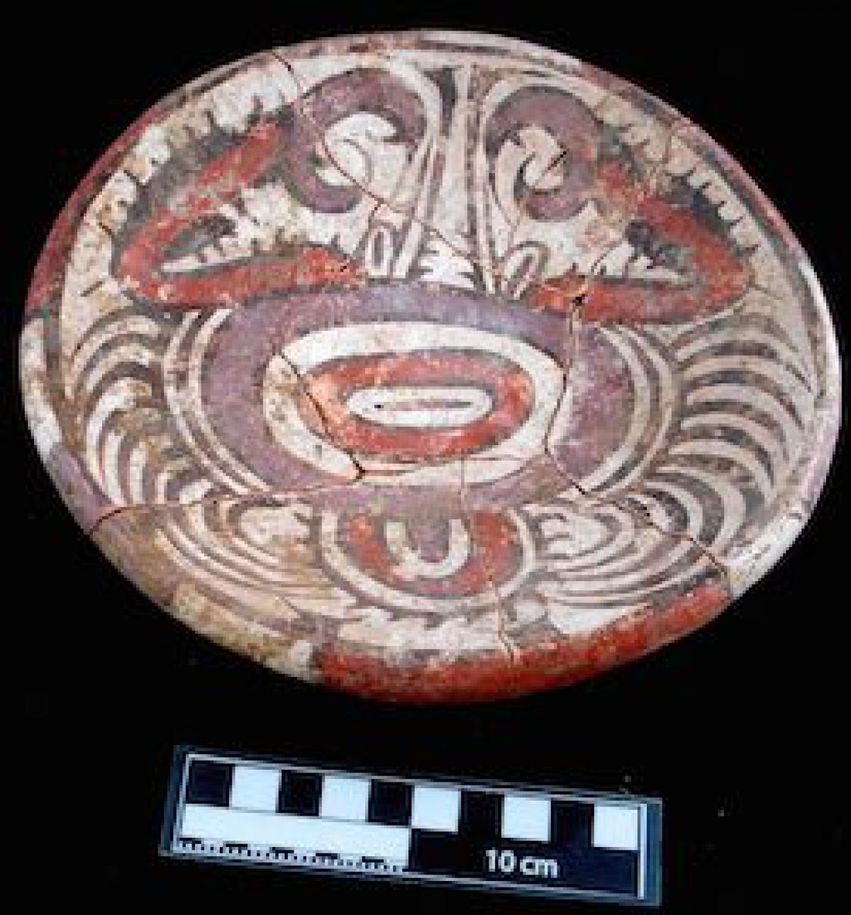 Description :   Small plate on a pedestal. White slip on the front, and a natural surface on the back of the vessel. The decoration is on two panels separated a red stripe. The decoration is geometric with divergent double “yc” spirals that have claw-shaped inner ends. The lip is decorated with alternating bands of red, purple, and white.