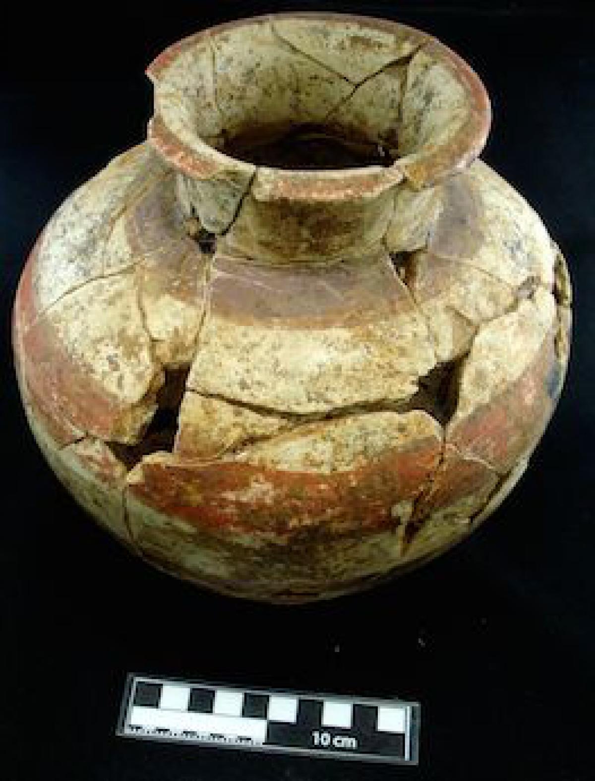 Description :   Globular jar with a ring base, long neck, and a laterally displaced rim. It is covered in white slip on which the decoration the decoration has been applied. This decoration consists of red and purple bands, and between them the white color of the slip is left exposed.