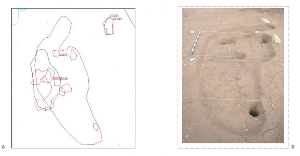 Description :   UE019. Court filled by the stratigraphic unit UE010, with irregular shape in plant. The walls are inclined towards the base of the cut at an angle of 120º. The base is flat, irregular and with five holes. Dimensions: 306 x 137 cm (SE-NW; SW-NE); depth ranges from 8 to 30 cm. - Hole 1: oval shape, 18 x 22 cm, and maximum depth of 10 cm. - Hole 2: shape in a kidney-shaped plant with a maximum length of 33 cm and width of 19 cm. Maximum depth of 16 cm. - Hole 3: shape in oval plant of 42 x 25 cm and 19 of maximum depth. - Hole 4: circular plant shape of 25 cm diameter and maximum depth of 15 ...