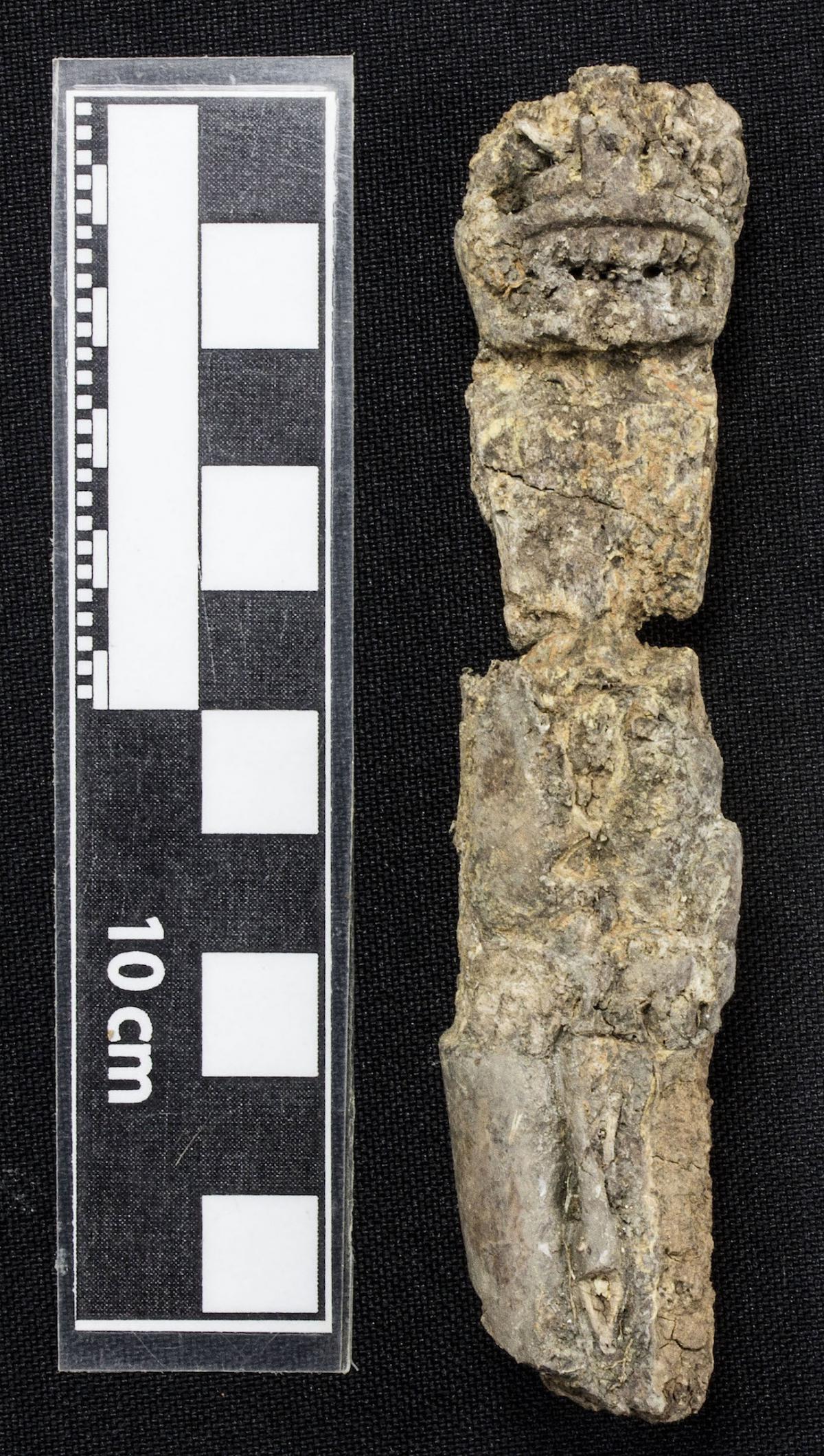 Description :   Bone carved into the shape of a mythical being. It is extremely deteriorated but the typical mouth with large teeth, feathery tail, and claws on the lower extremities can be seen.