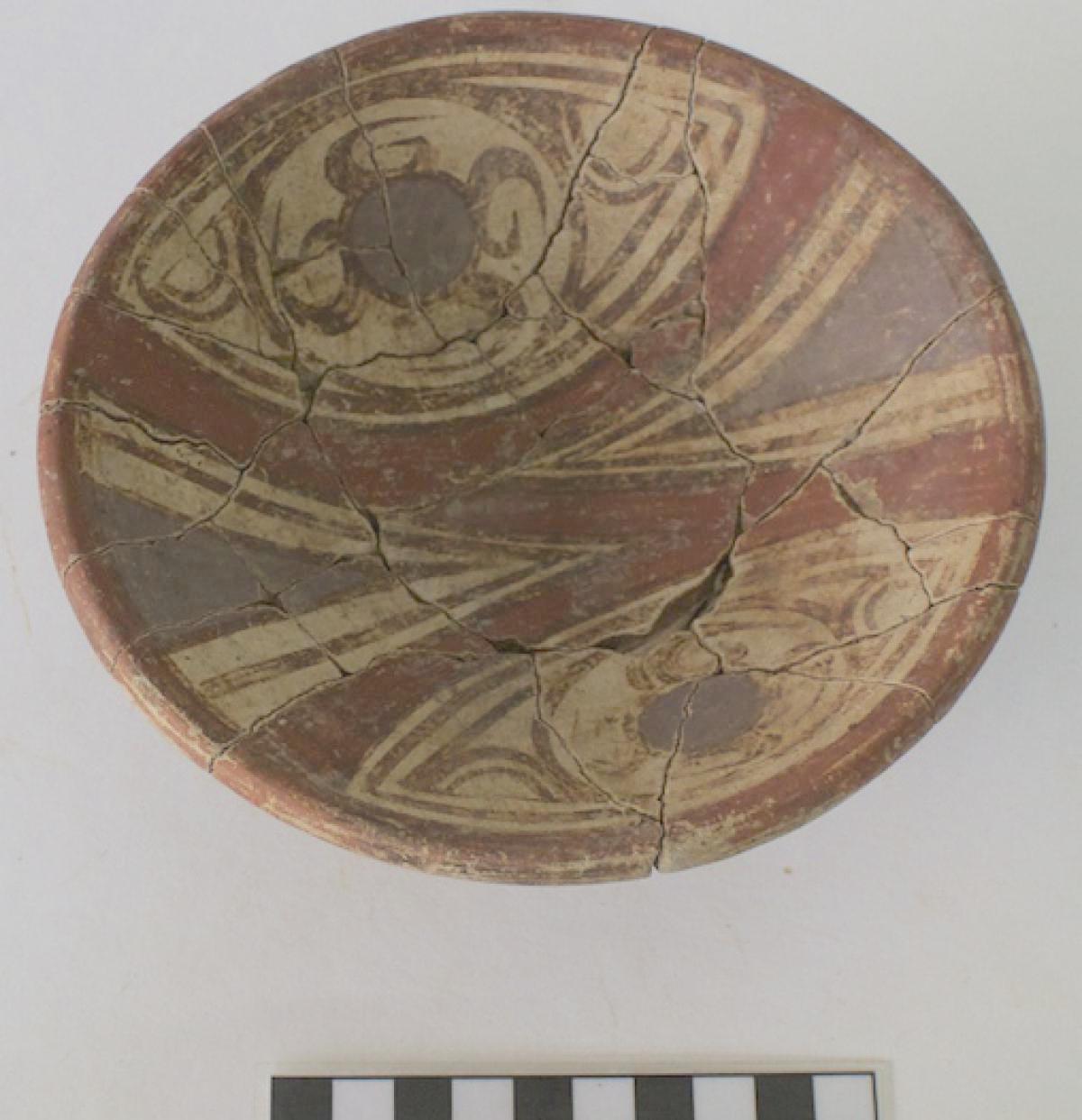 Description :   Bowl with a ring base and rounded rim. White slip on the interior of the bowl, and natural surface on the exterior. The decorative field is divided into two panels by means of red “zigzag” band. Both panels have geometric decoration.