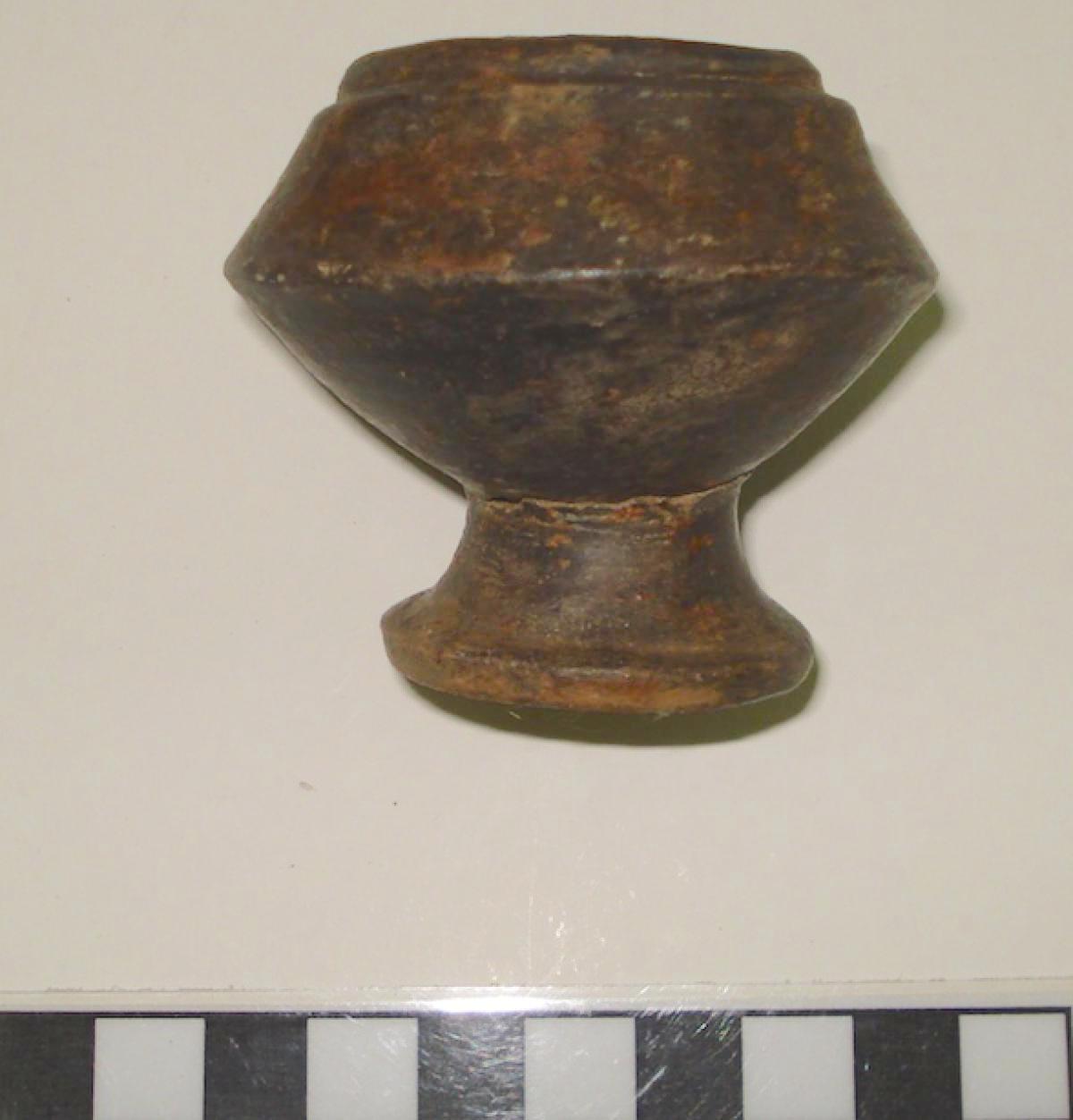 Description :   Miniature carinated bowl on a pedestal, with a stepped rim. The black surface is a product of the firing of the piece in a confined space.