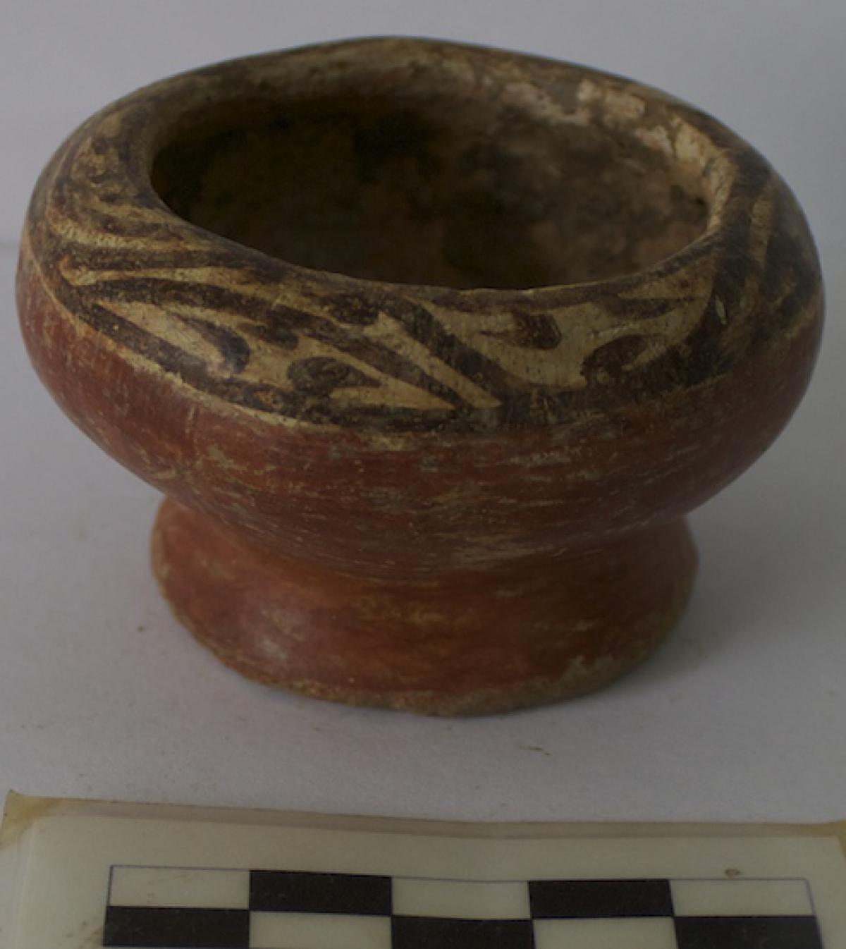 Description :   Concave bowl on a high ring base, with a rounded rim. It features red slip on the exterior of the piece and white slip on the lip, on which are also painted geometric patterns of curved lines and festoons in black.