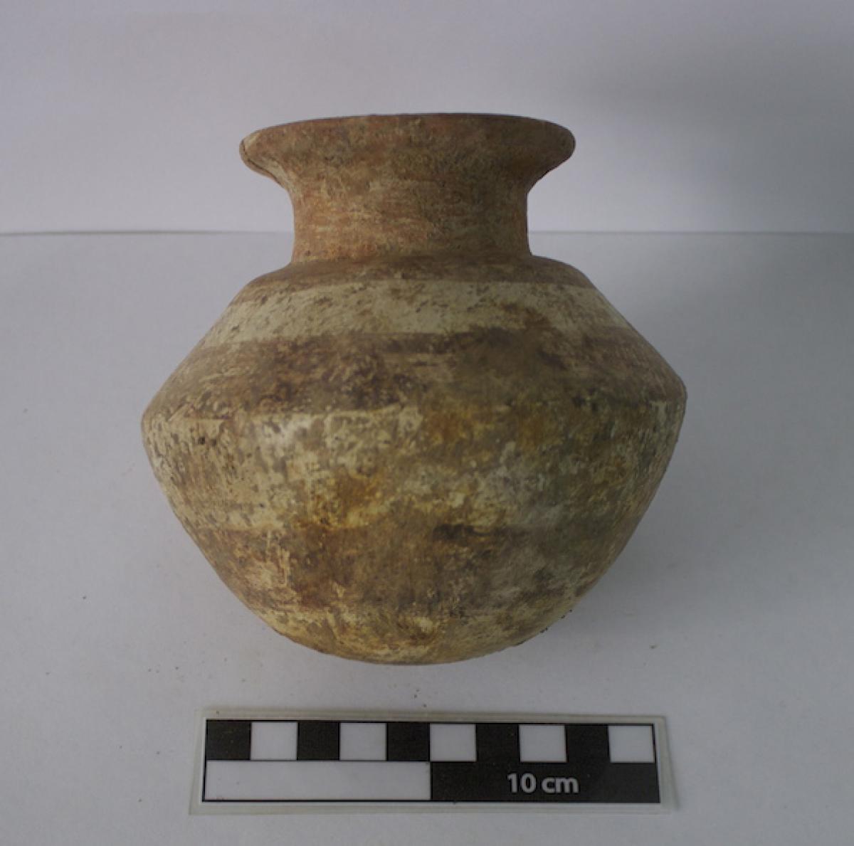 Description :   Jar with a curved base, concave body, and a narrow mouth. White slip on the exterior and decoration in the form of red and purple bands, which leave the white color of the slip visible between them.
