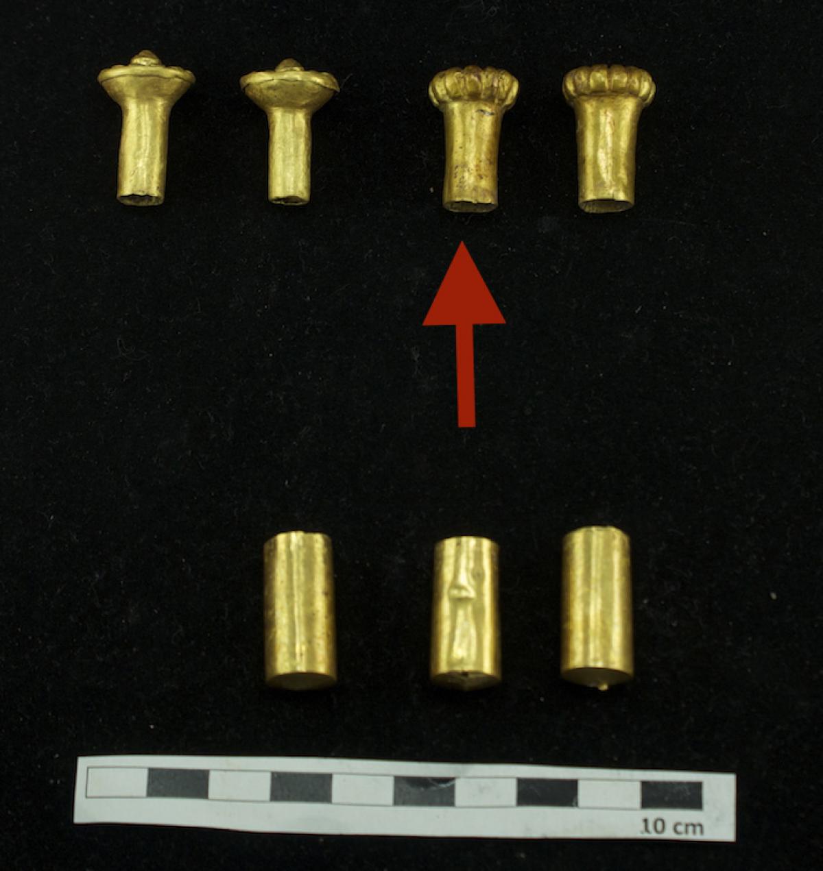 Description :   Gold sheaths of a wooden ear rod. Found in a package of objects on individual I7, the main occupant of tomb T2.
