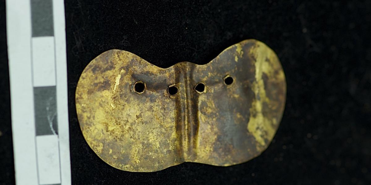 Description :   Small gold breastplate in the shape of a stylized butterfly with four holes to hang or sew on the upper part of the plate. The vertical band, embossed on the central vertical axis of the piece, and its general shape, suggest a pair of semicircular wings and it produces a certain resemblance to a very stylized butterfly. MG