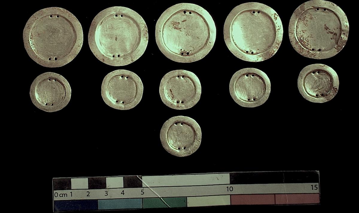 Description :   Group of circular plaques. These plaques have different diameters and all of them have a light circular rim and four perforations each. These perforations have been made to allow it to be sewn to clothing. For this reason we call them shirt accessories. They were designed to give color and sparkle to garments.