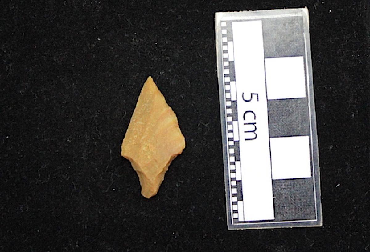 Description :   Stemmed projectile tip made from a chip of cream-colored chalcedony.