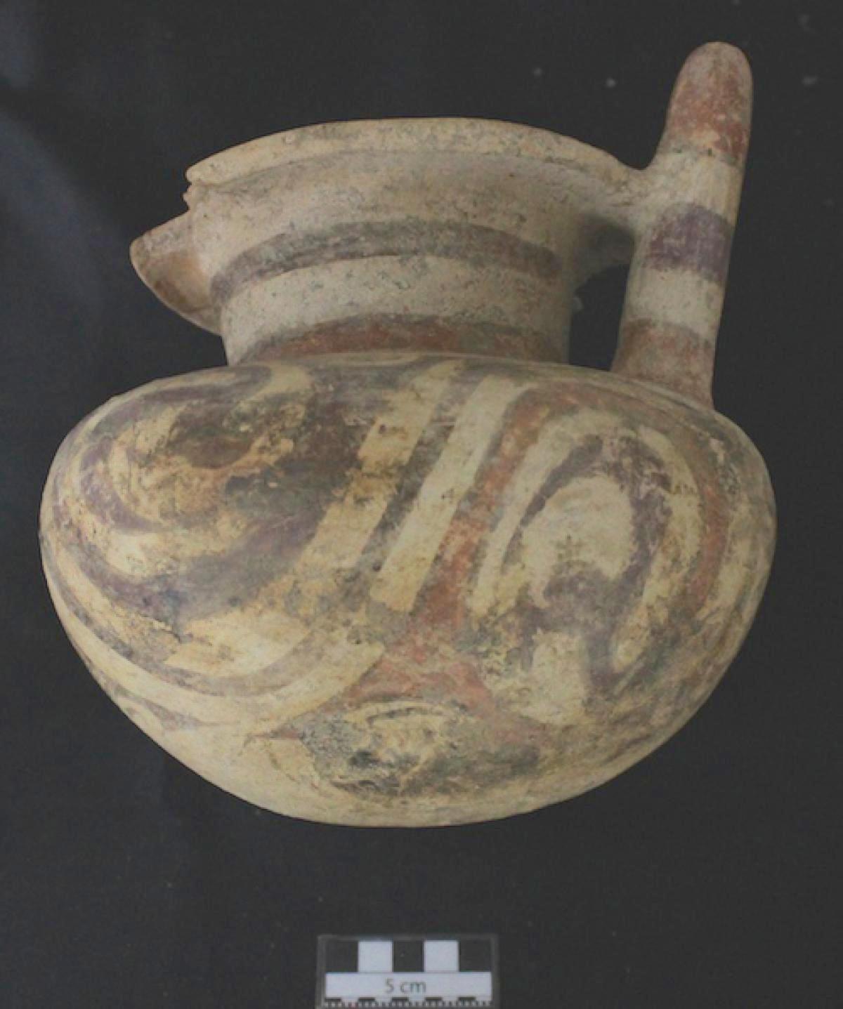 Description :   Long-necked globular vessel with a laterally displaced rim. It has cream-colored slip on which are painted red “yc” spirals with inner ends in the form of claws. There is also a purple band on the rim, and black lines on the shoulder. The decoration on the lip consists of a black line with small geometric designs joined to it.