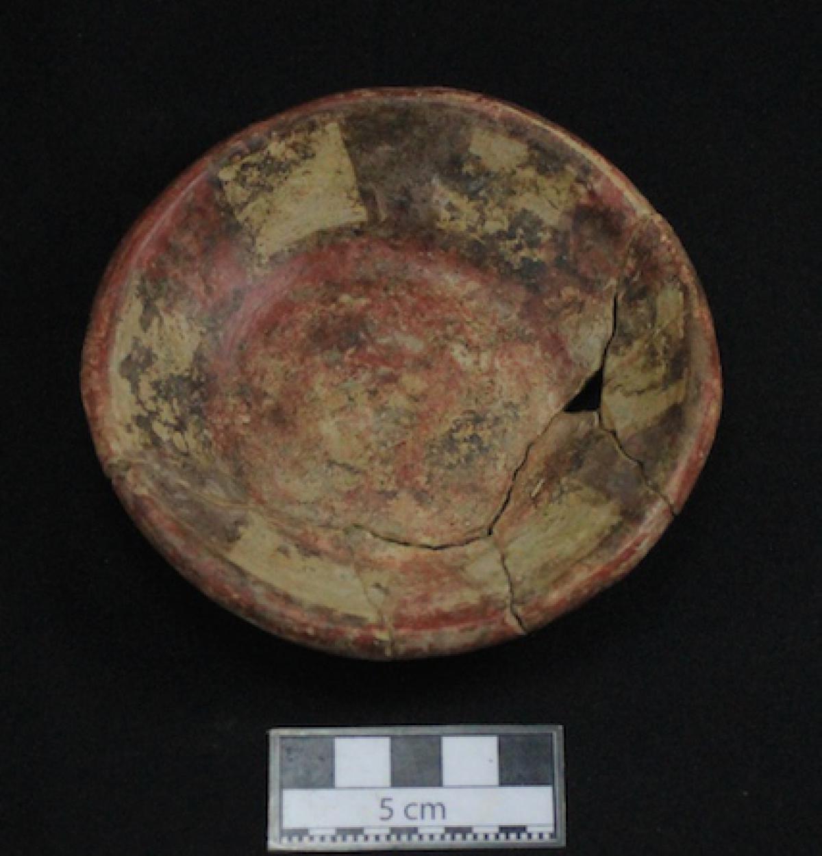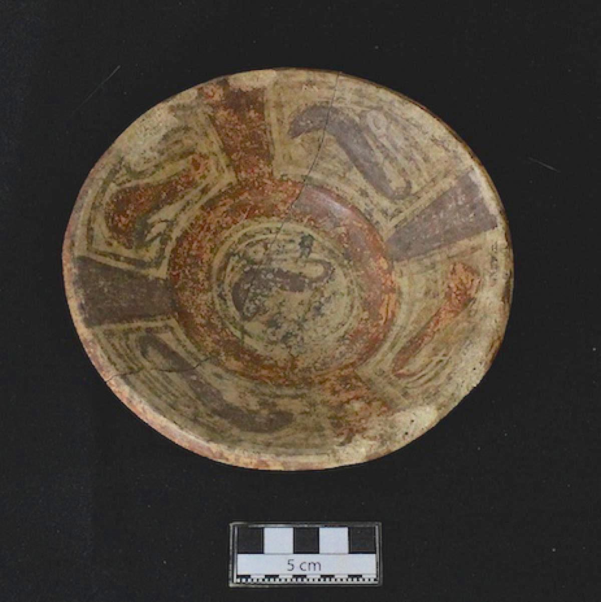 Description :   Bowl with a flat base, and slightly convex walls and rim. Red slip on the exterior, and white slip on the interior. It is decorated with red and purple bands arranged alternately, leaving the white color of the slip visible between them.