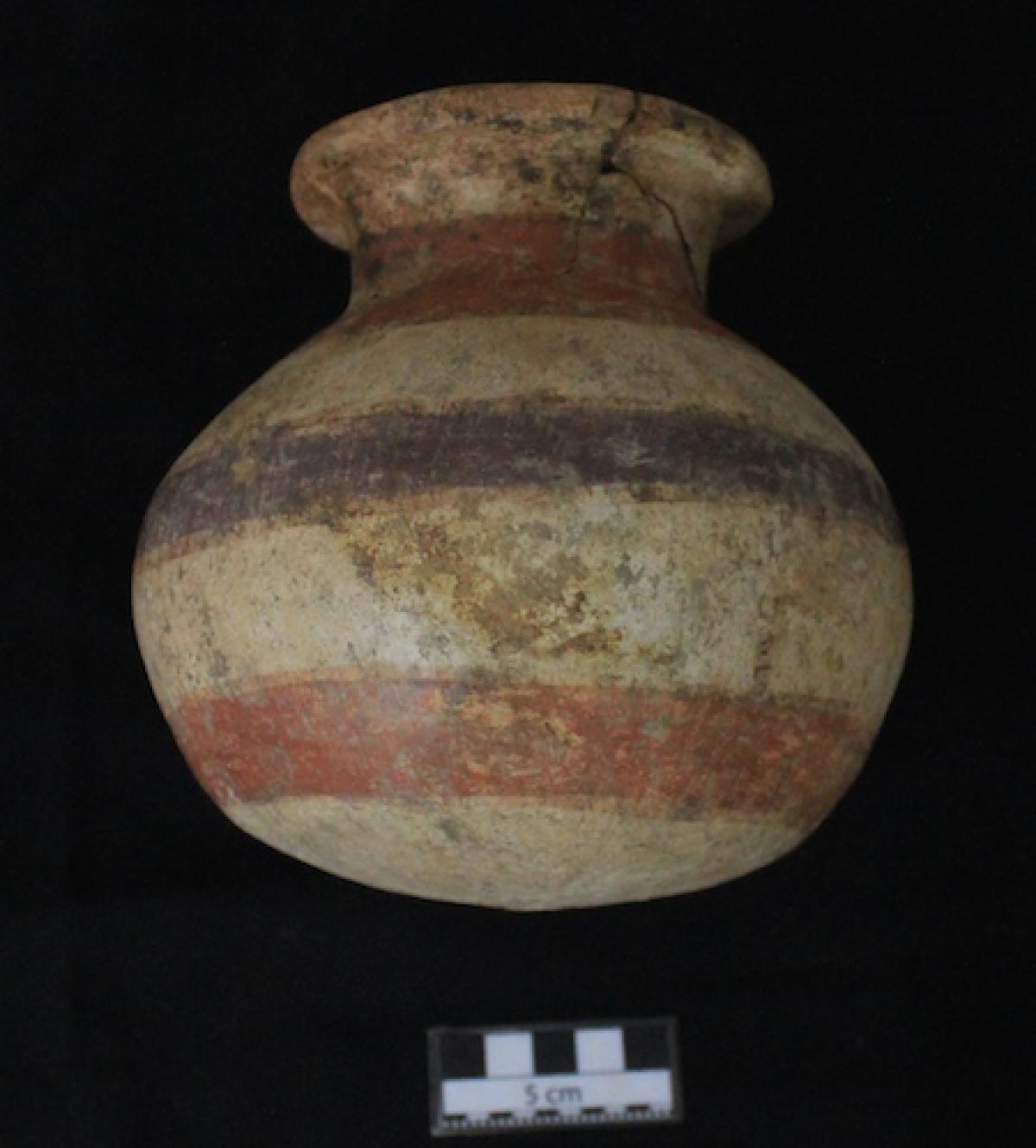 Description :   Globular jar with a convex base, long neck, and an everted rim. It features white slip on which are painted red and purple bands outlined in black.
