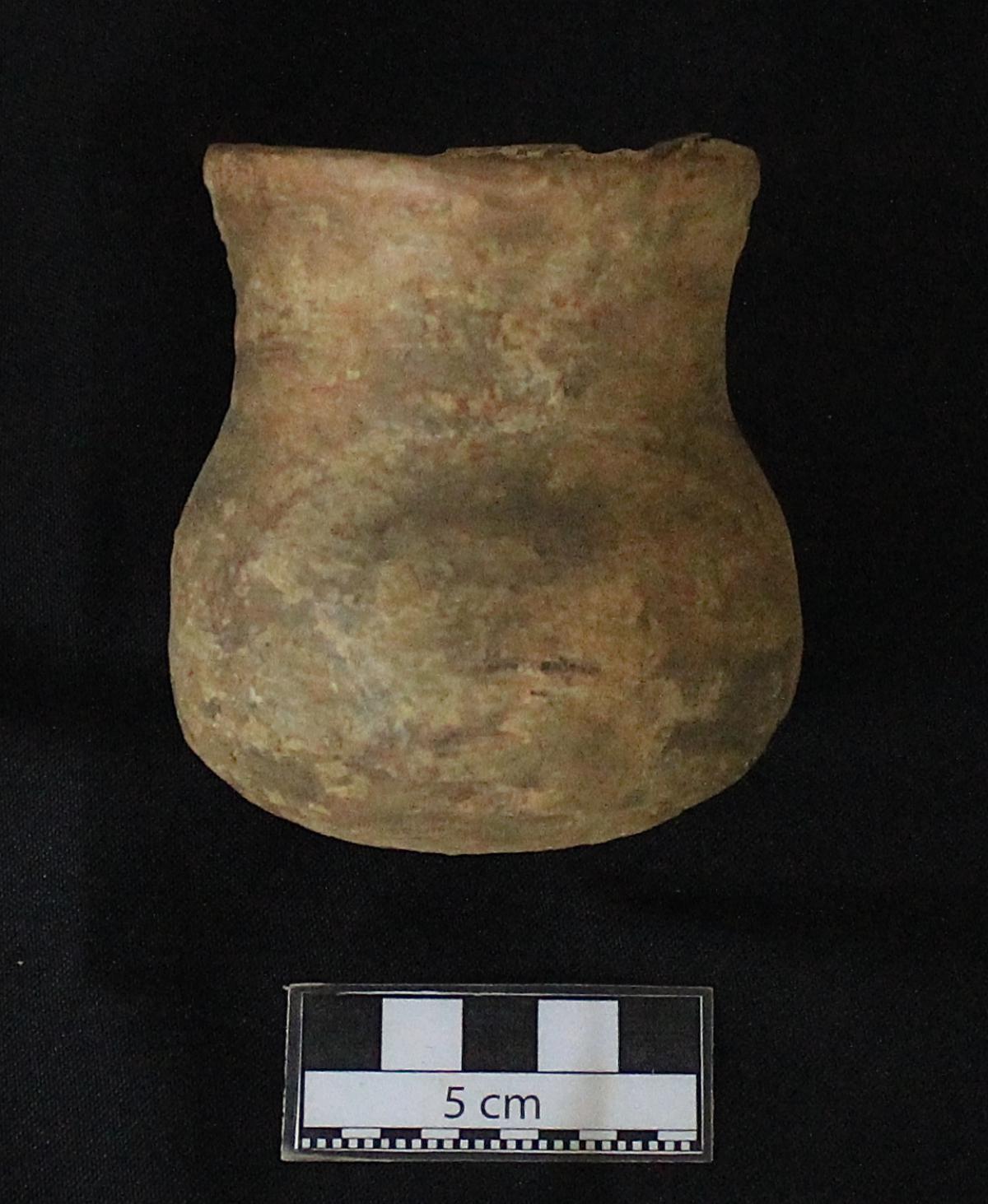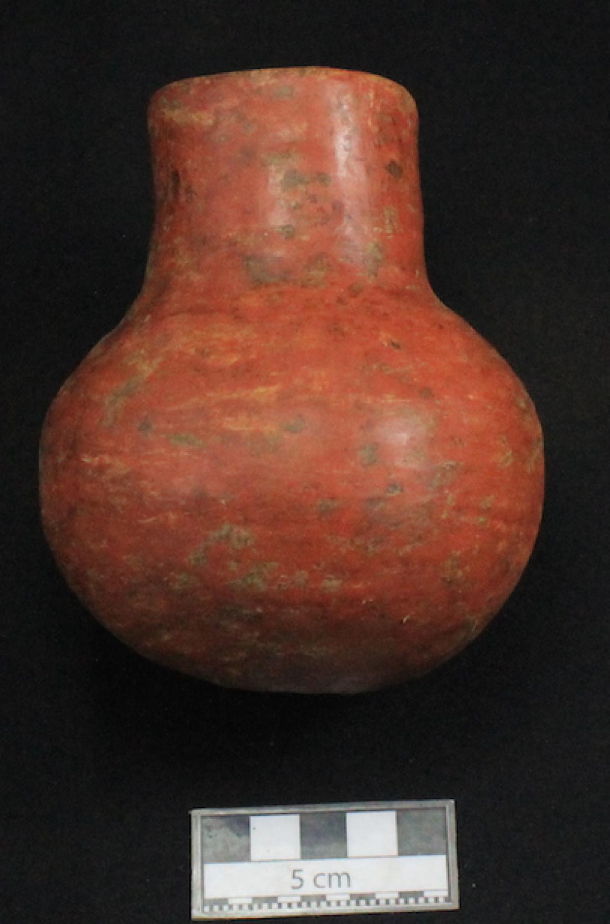 Description :   Small globular jar without a ring base. It has a long neck and straight rim. Red slip on the exterior.