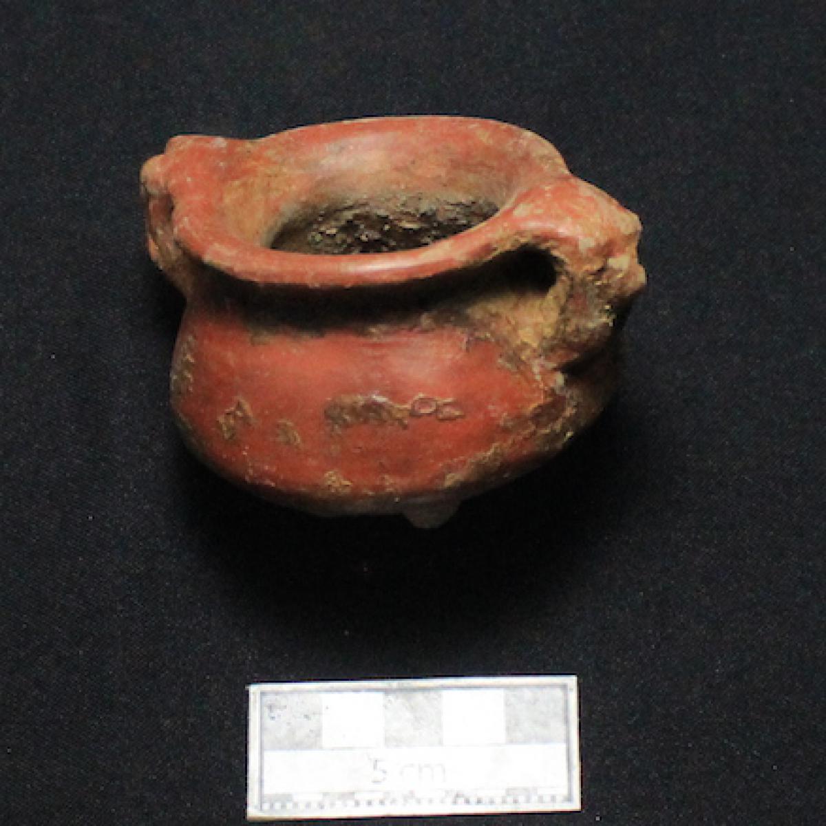 Description :   Small vessel with a tripedal base, carinated body, and a thickened rim. It does not have a neck. Two small handles, with presumably anthropomorphic faces, join the rim to the body of the vessel.