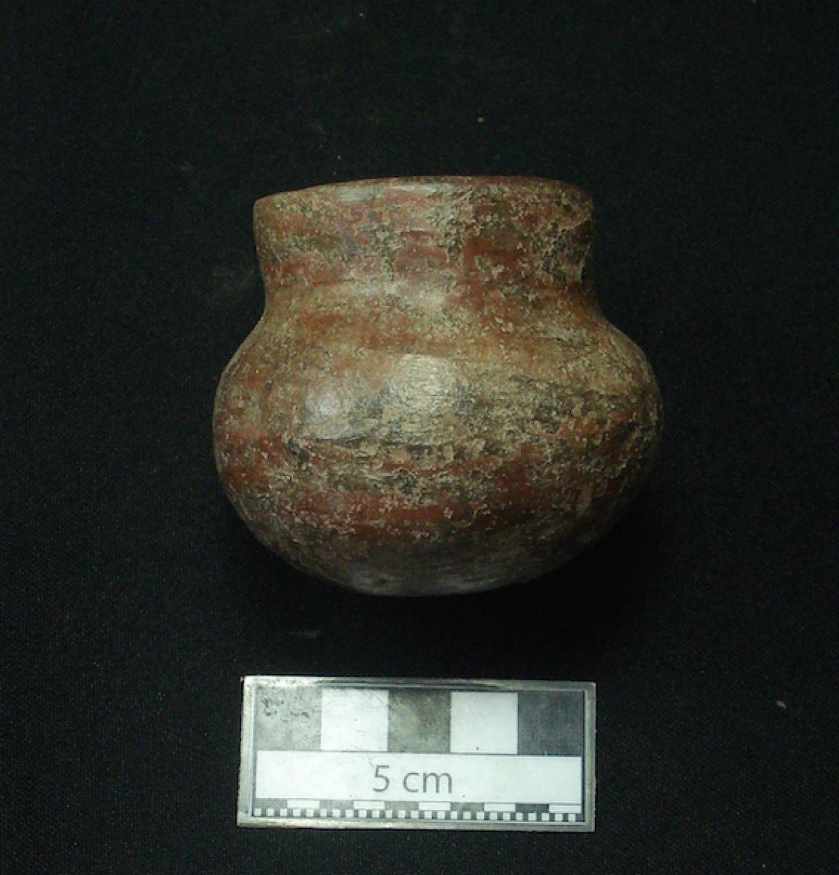 Description :   Miniature jar with a flat base, slightly convex body, short neck, and a thickened rim. Red slip on the exterior of the piece.