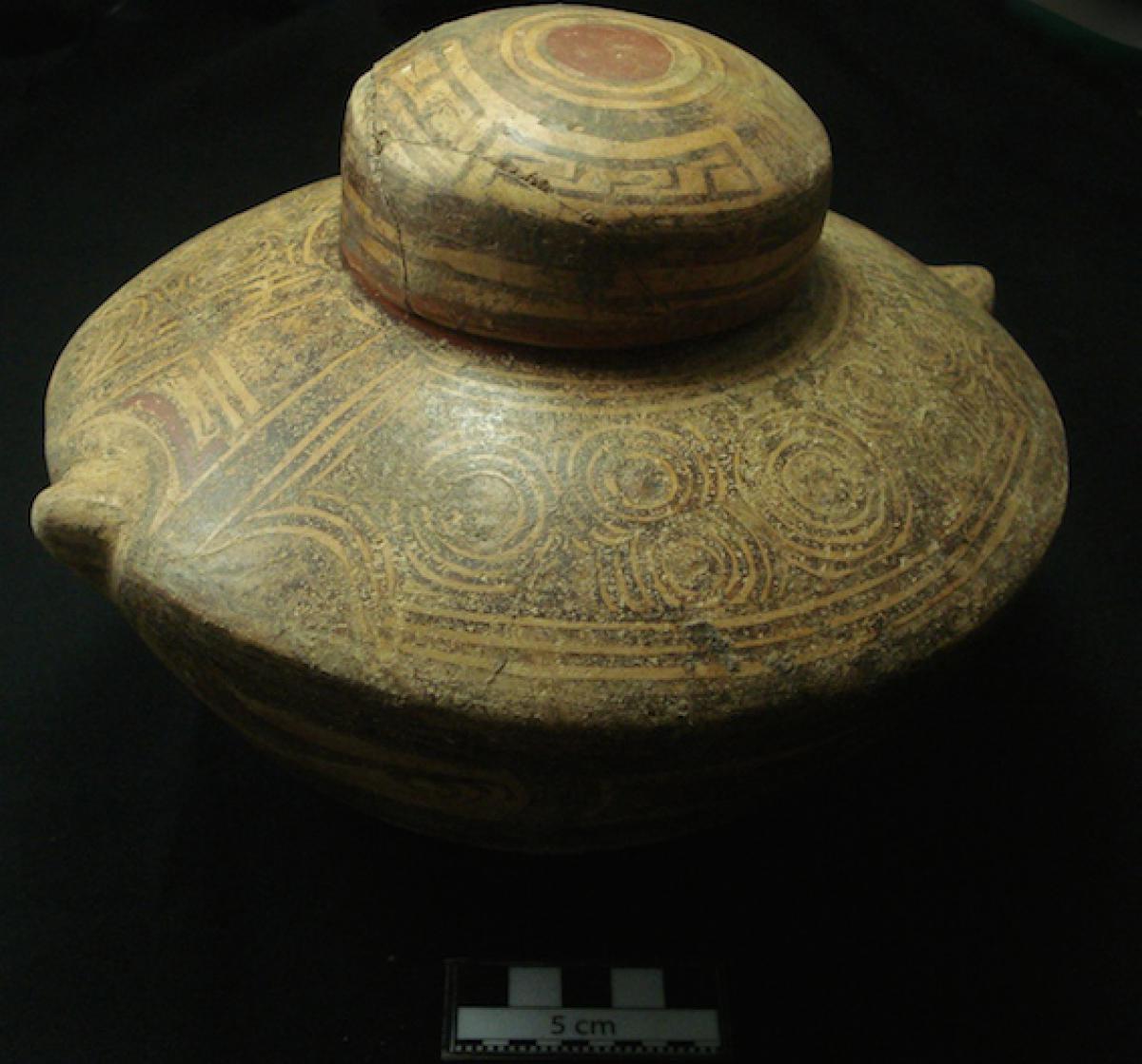 Description :   Zoomorphic effigy (turtle), in the form of a sub-globular carinated vessel with a raised rim. It has a lid in the form of a small bowl with a curved base and straight walls.
