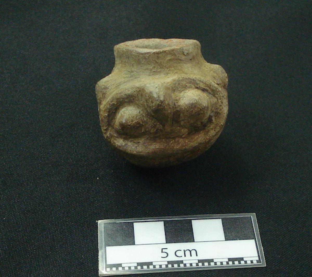 Description :   Anthropomorphic bowl-shaped lid. It features red slip and decoration in black, red, and purple.