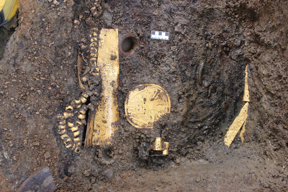Contexto de aparición del pendiente figurativo de cobre fundido CU11149 formando parte del ajuar funerario del individuo principal de la Tumba T4. Es posible observarlo boca arriba, hundido en el terreno, a la izquierda del pectoral de oro.